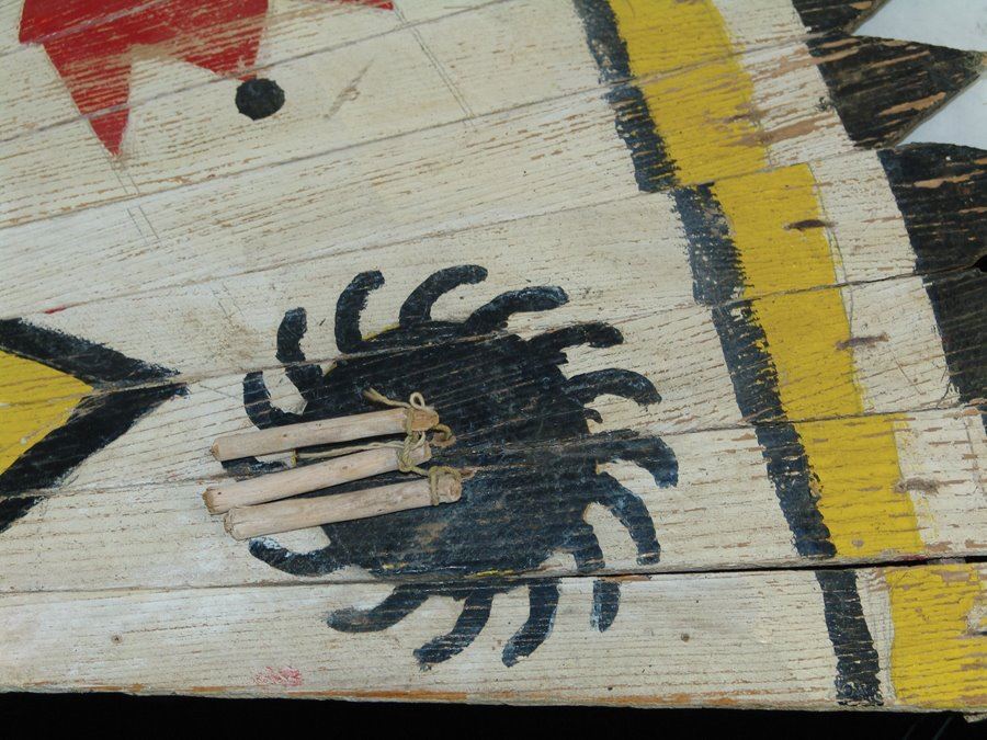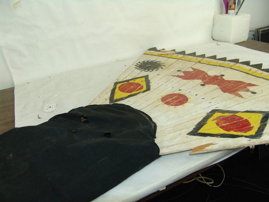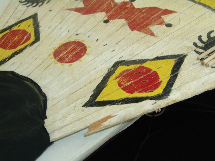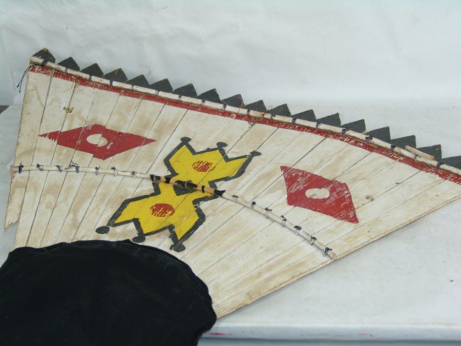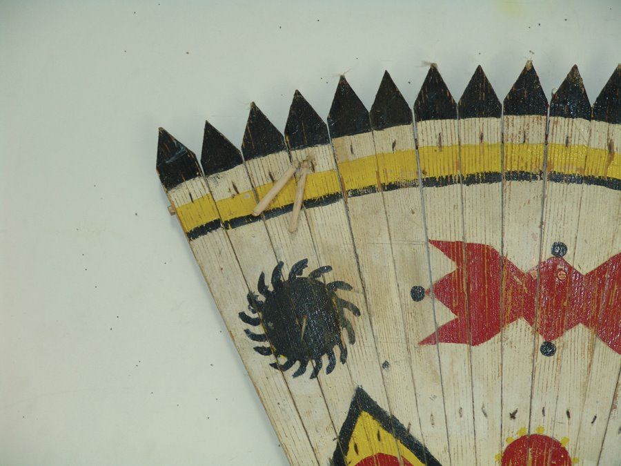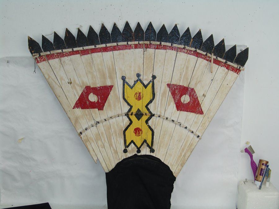 Early traditional hand carved and painted wooden Gaan /Crown Dancer's headdress with interesting, colorful symbols and with black cloth hood. Very good condition.,Early/Mid 1900s,33" x 29"