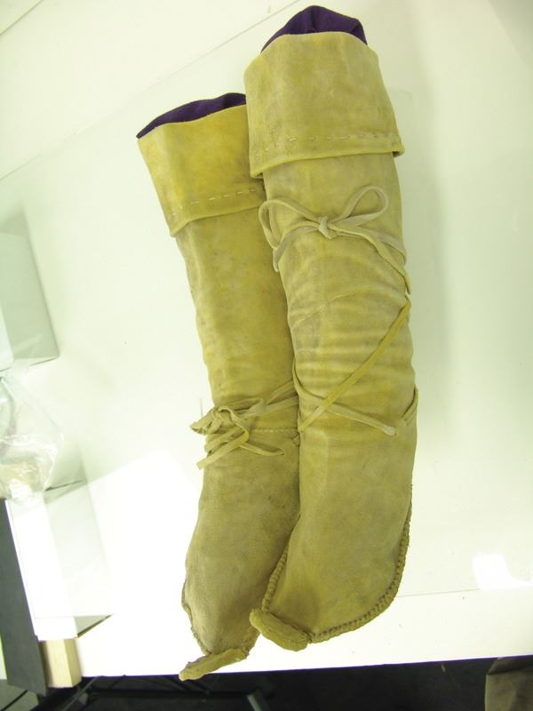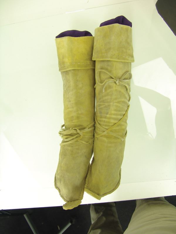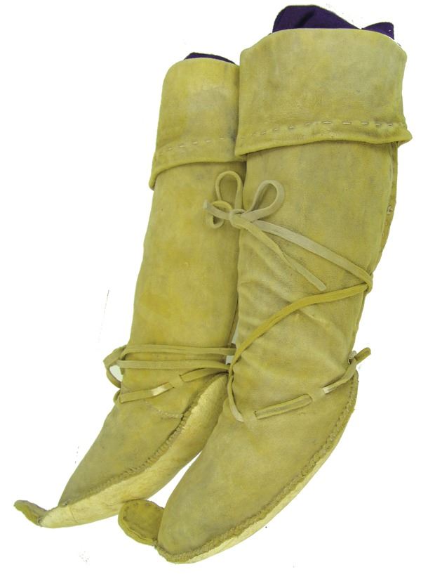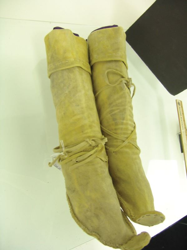 Ca. 1960-70s 10-1/2" Traditional pair of high top, buckskin boot moccasins with Apache toe tabs, hard soles, and traditional lacing. Very good condition, shows use. **These are from the private display collection of the "Largest Rose Tree in the World, and Museum" which has been located in downtown Tombstone, AZ for the last 30 years.