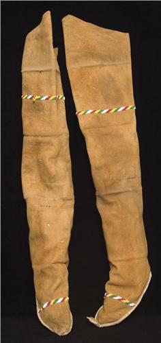 Apache Hightop Moccasins. 25" tall. Strip beaded on yellow ochred Indian tanned hide. 20th Century. Minor bead loss. (est $500-1,000).