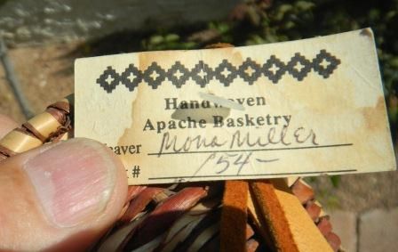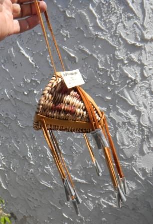 Basket has tin cones and made from willow and hide. This Apache miniature basket is from Arizona. Maker is Mona Miller. This measures 10x4 inches including drops. Shipping is $12.50. Condition is good