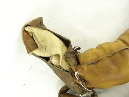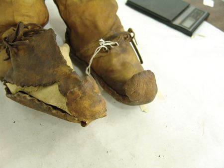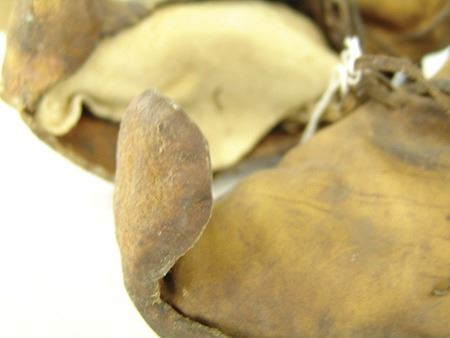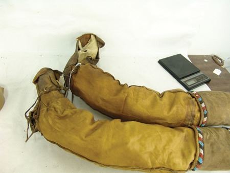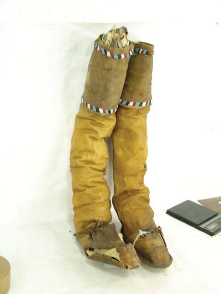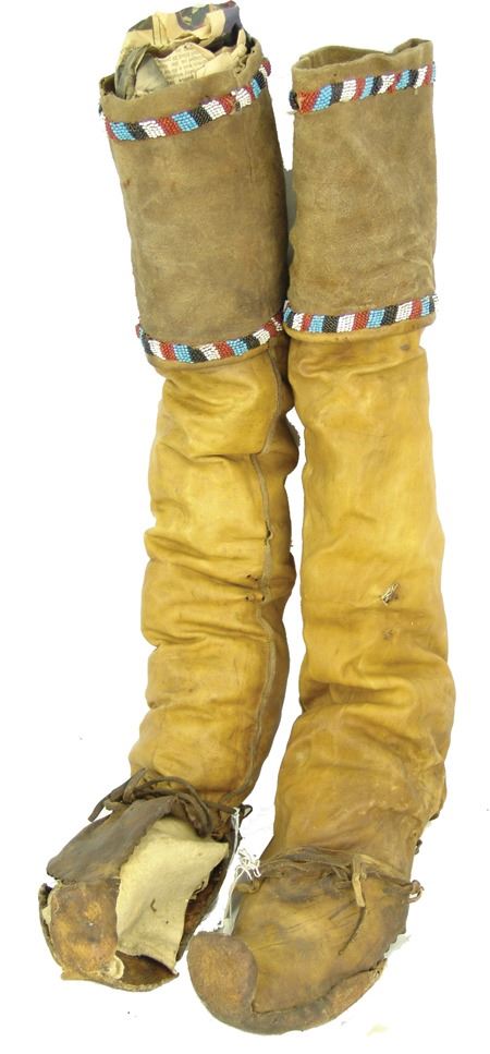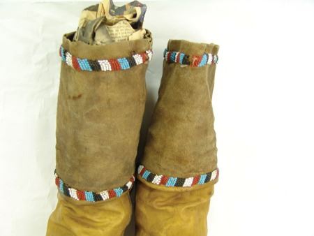 Early/Mid 1900s, Very old pair of buckskin/rawhide moccasins with traditional toe tabs (these displayed fully extended), the tops with beaded trim. Poor condition, uppers intact, soles there but mostly detached. 9" - 22" tall