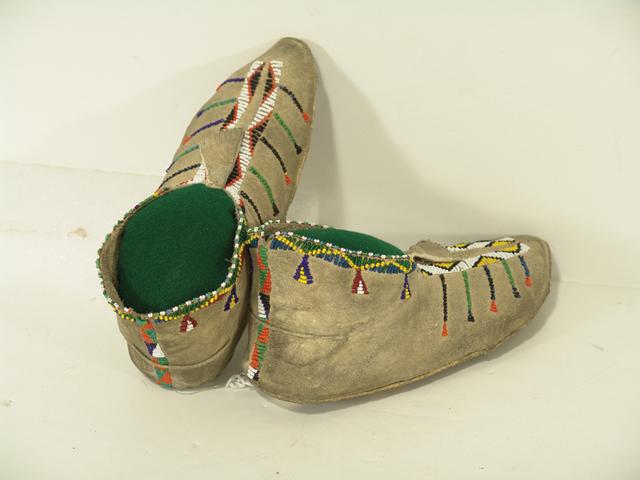 Early 1900s, Classic pair of beaded buckskin moccasins with hard rawhide soles. 10-1/2"