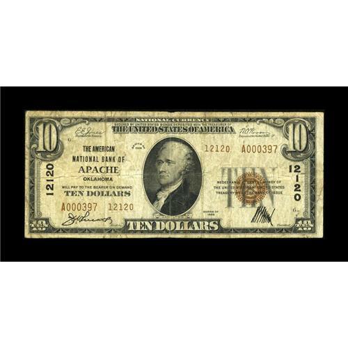 <B>Apache, OK</B></I> - $10 1929 Ty. 2 <B>The American NB</B></I> Ch. # 12120<BR>An always in demand note from a town which bears a sought after Native American name. <B>Fine,</B></I> with just a touch of soil.<BR><I>From The Rolling Plains Collection</B></I><BR><BR><b>Shipping:</b> Coins & Currency (<a target="_blank" href="http://www.heritageauctions.com/common/shipping.php">view shipping information</a>)