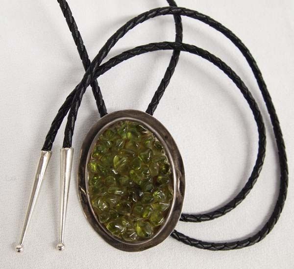 Apache Old Pawn Sterling Silver Peridot Bolo Tie, slide measures 2.5'' x 2'', sterling tips are new, features peridot nuggets surrounded by a stamped feather border, 45g in total wt. Very unusual older piece.