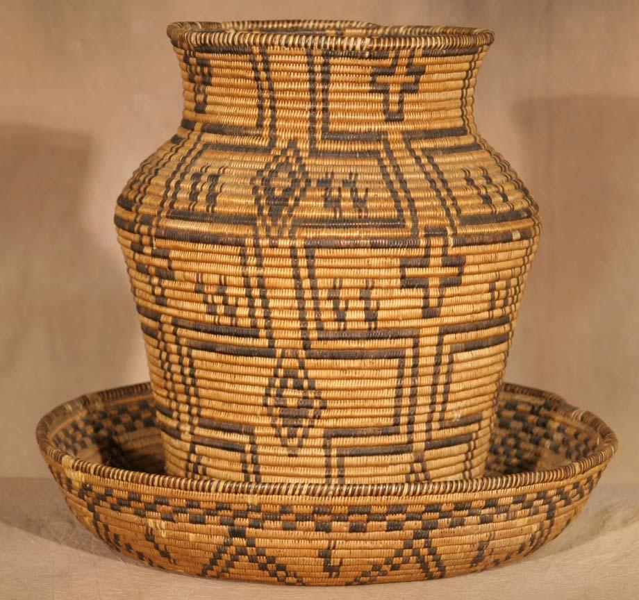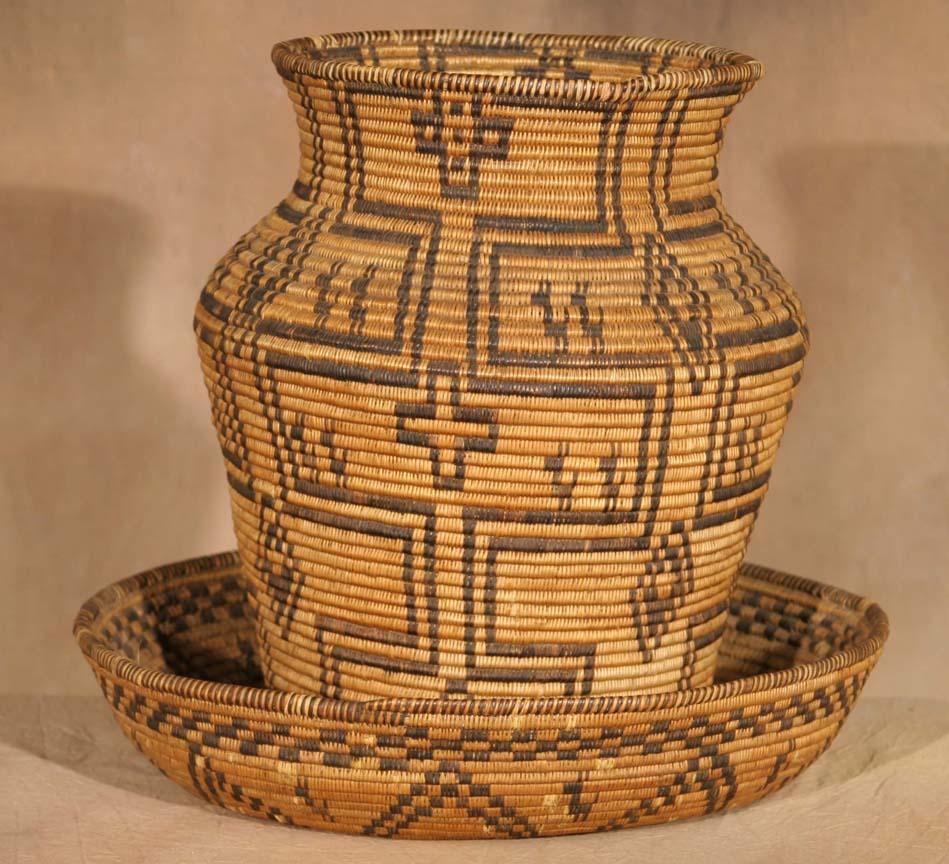 Apache Olla With Tray. 13" x 14". One piece. Geometric design with pairs of dogs. 19th century. (est $5,000-6,000). For condition reports please visit: www.auctioninsantafe.com/cr2011.pdf