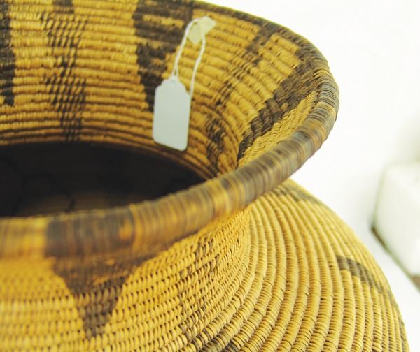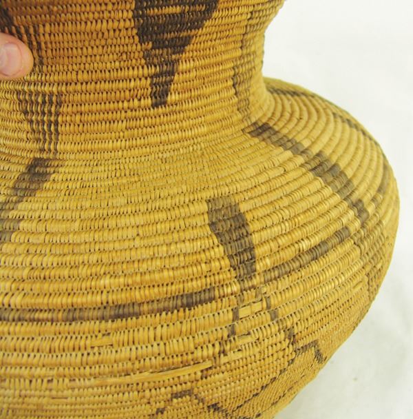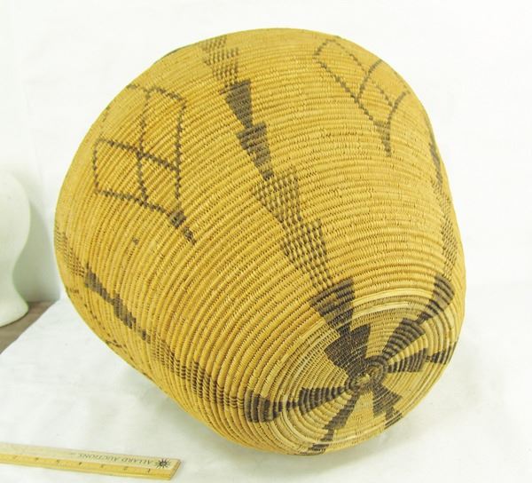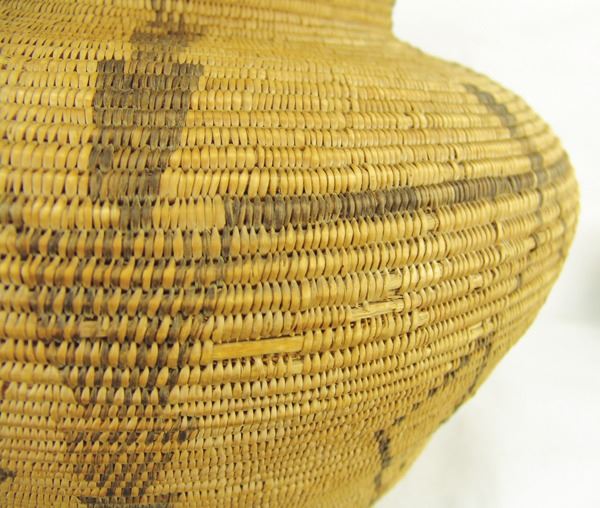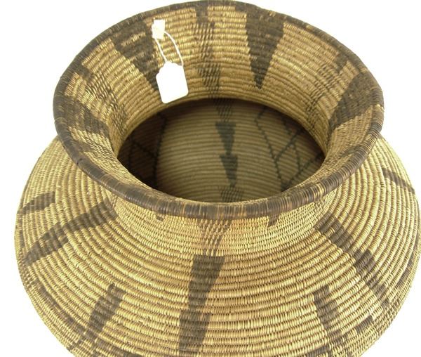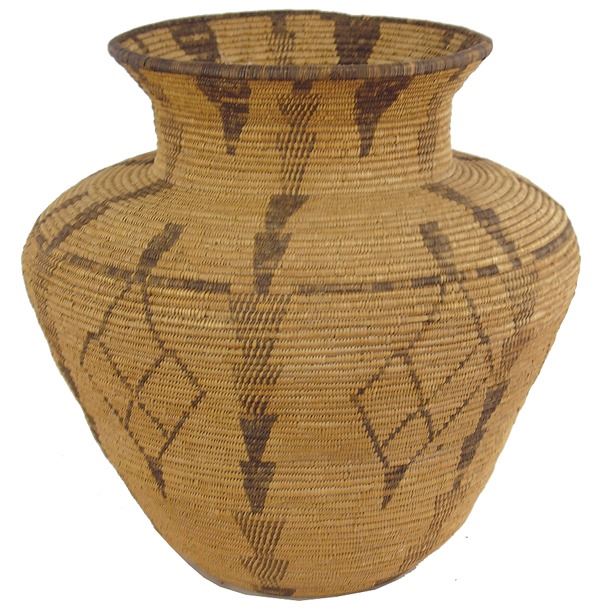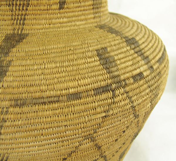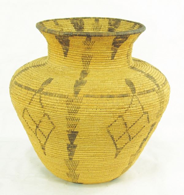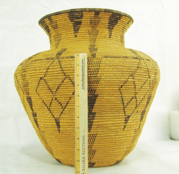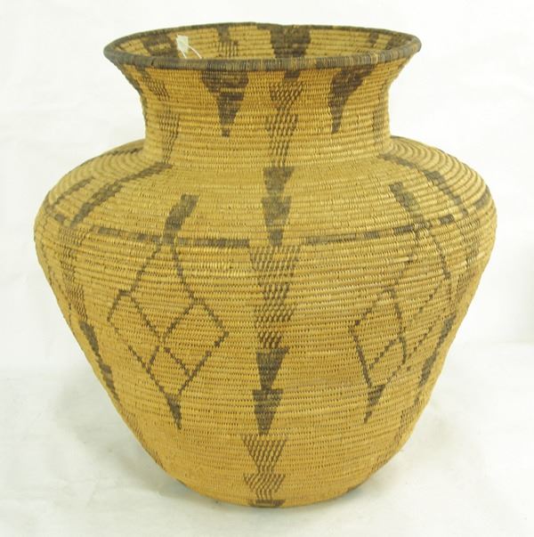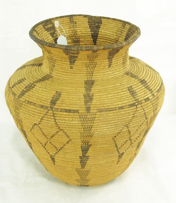 Large and impressive, wider-bodied woven basketry olla with repeating diamond blocks and vertical rows of solid and checkered down-pointing arrows. Very good condition, minor stitch loss around shoulder. VisuallyCa. 1930s-1940s18" x 18"