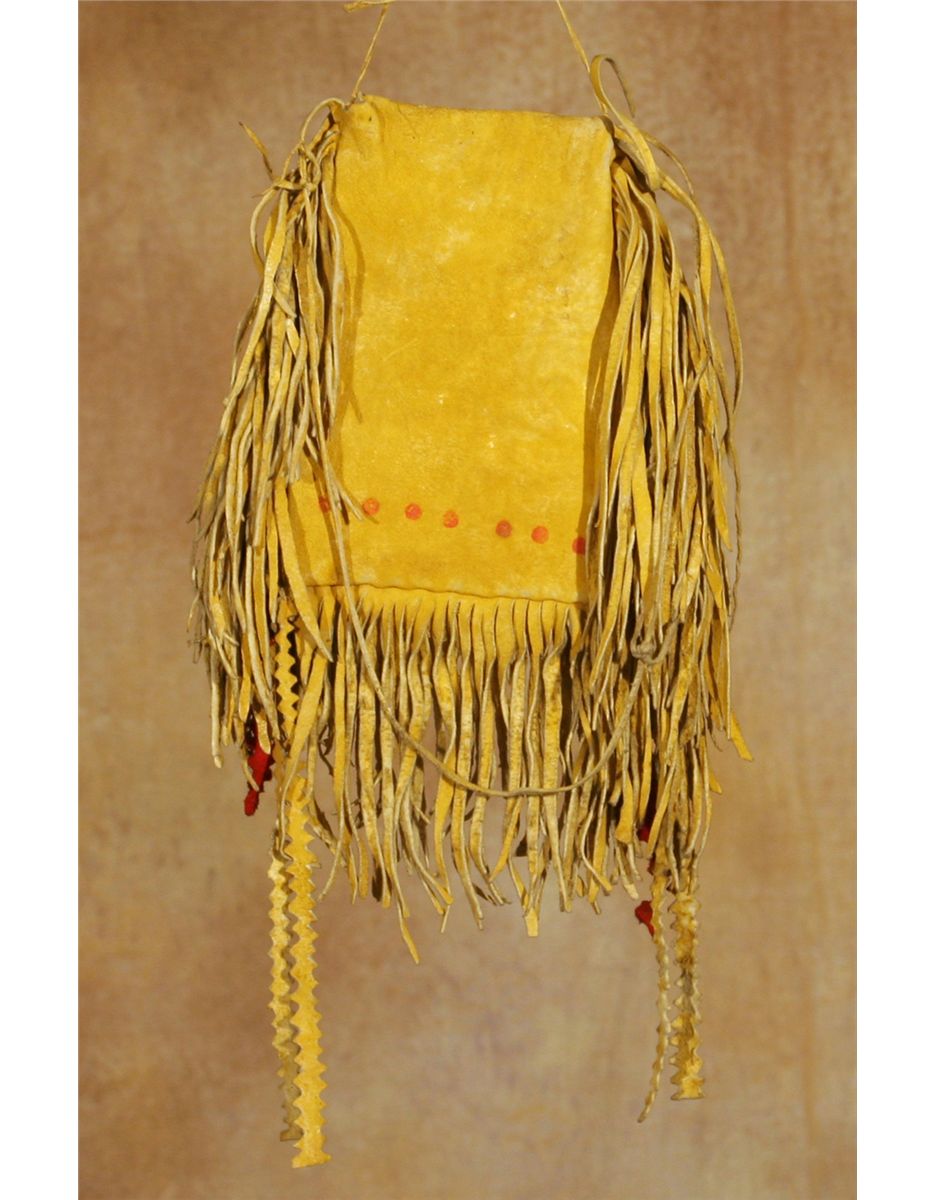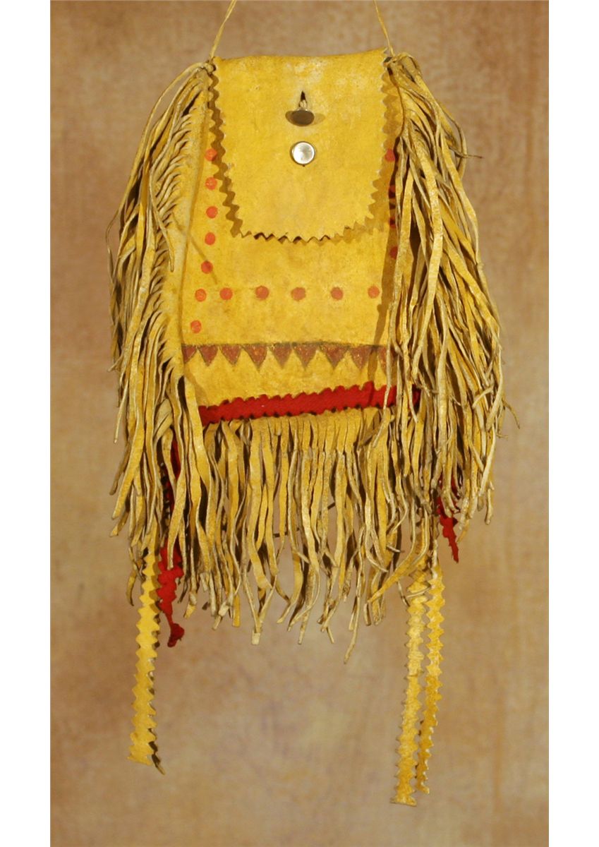 Apache Painted Bag. 7.5" x 5" at widest point. Yellow ochred hide decorated with painted designs and cloth accents. 4.5" fringe all around plus cloth and leather drops from bottom corners. 19th century.
