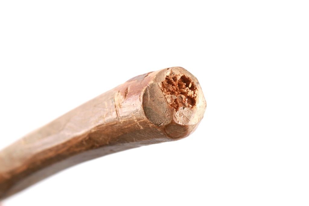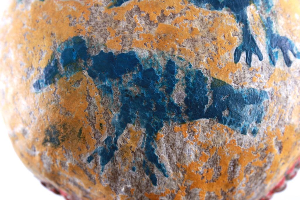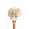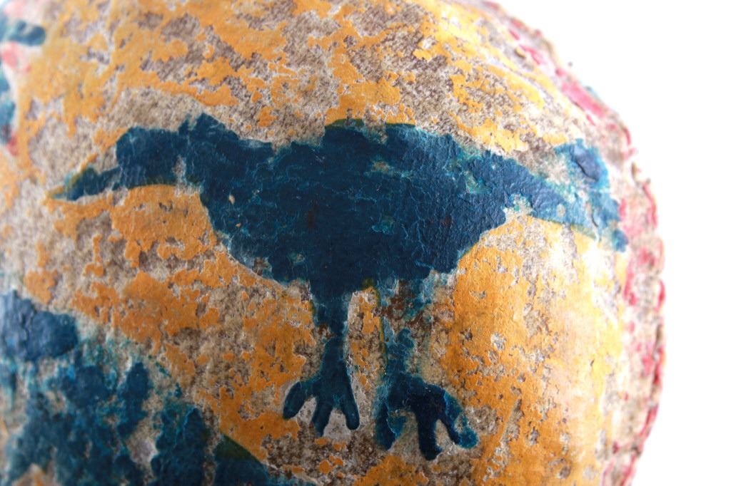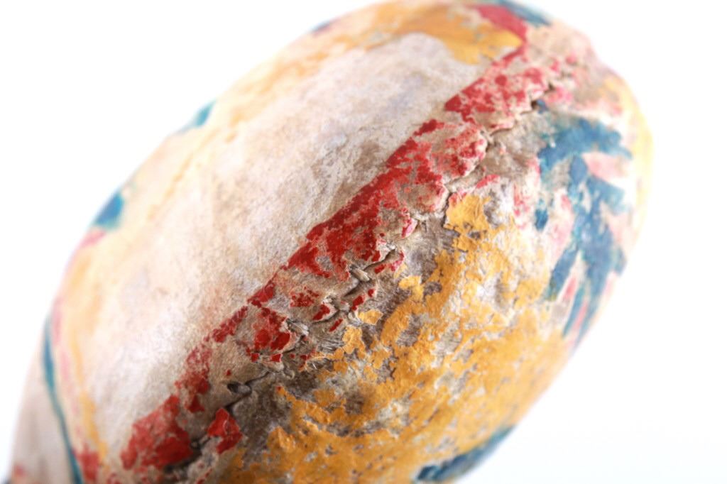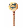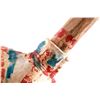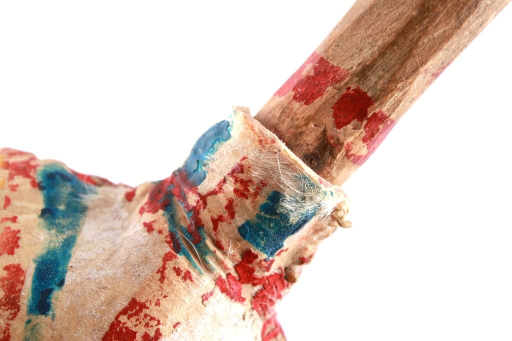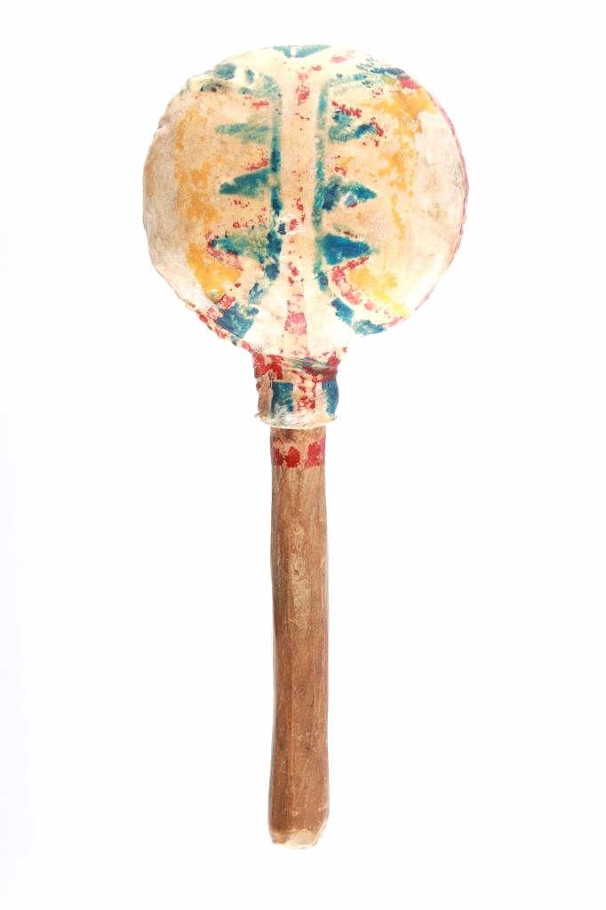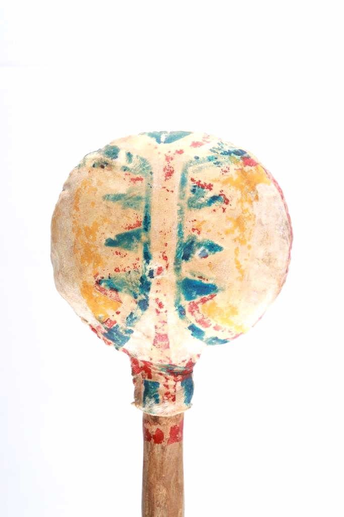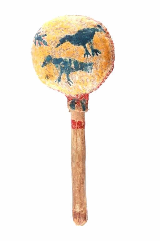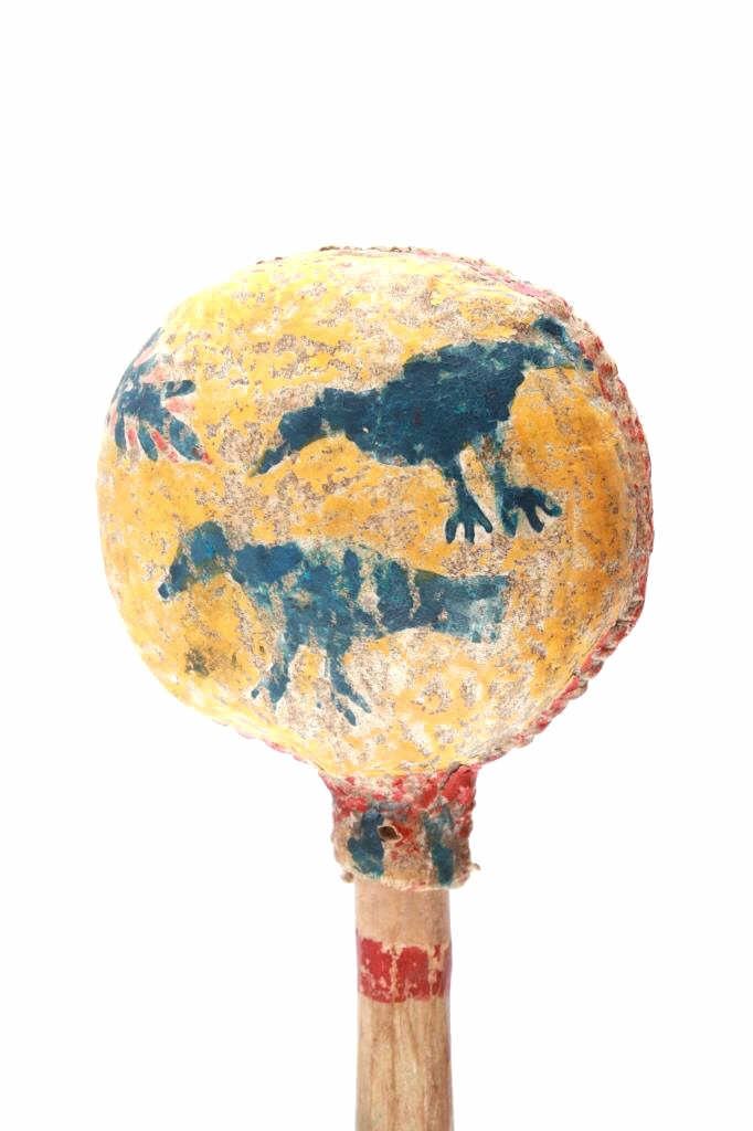 The lot features a fantastic parfleche and wood rattle with pictorial polychrome paint dating to the 19th Century from the Apache Native American Indians. The piece shows hard parfleche rawhide with sinew rawhide sewing on a carved stripped wood handle. The entire parfleche rattle is covered in mineral pigment polychrome pictorial painting showing two bird fetish figures, likely ravens, and a geometric pattern on the back. The wood handle, which is carved and has a stripped hewn finish, has a dark patina from honest age and use. The handle can be removed and is slightly loose but does stay in place. The rattle has small rocks inside giving a nice sound. Provenance: From the renowned Sundog Fine Art Bozeman, Montana collection by Bruce VanLandingham. Bruce VanLandingham was a pillar in the American Indian collecting community and a respected expert. Along with being an avid collector, Bruce was also the sole owner of Sundog Fine Art Gallery in Bozeman, which was both part museum and gallery, this piece is directly from the collection. Measures8 5/8"L by 3.5"W vt 2.25"D. Museum collection number E1050.