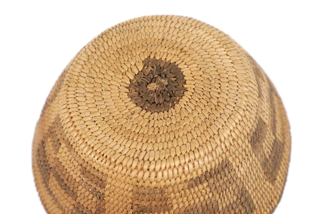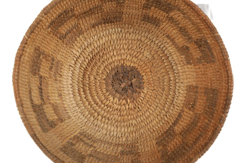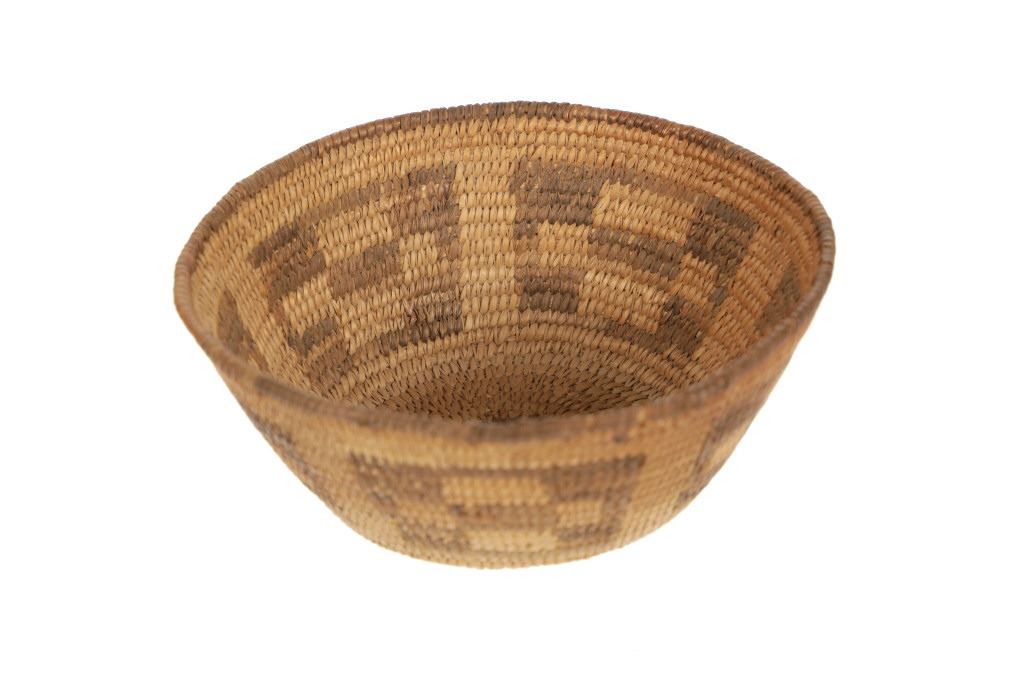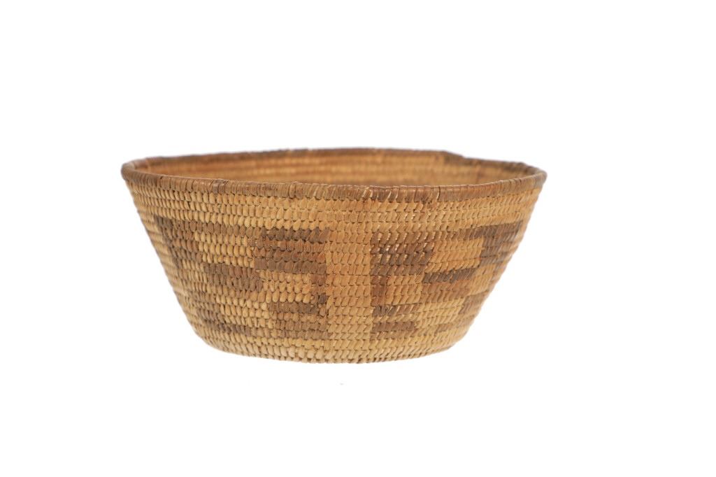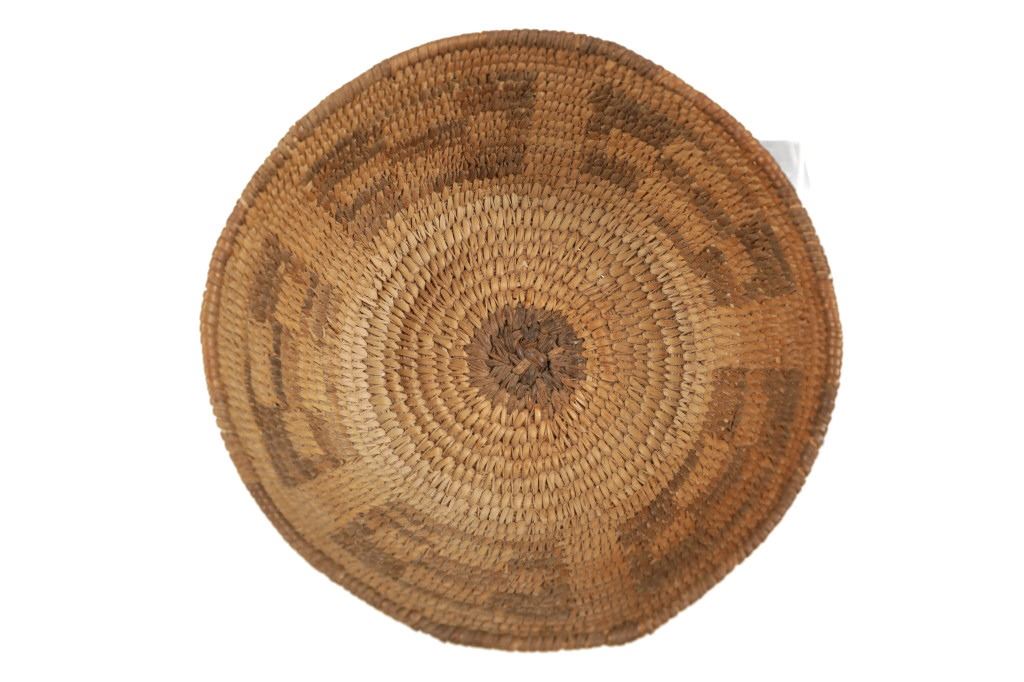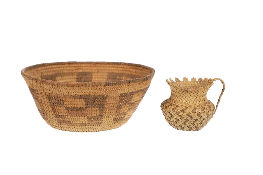 Featured in this lot is this Apache polychrome hand woven basket pair circa 1930's. There are two baskets in this collection. The first features a wonderfully and professionally crafted Devil's claw hand woven construction with polychrome geometric patterns woven into the side walling of the basket. The smaller basket is wonderfully and professionally hand woven Devil's Claw that shows polychrome decoration woven into the side walling of the baskets and shows a scalloped rim with a hand woven handle into the basket itself. The condition of these two baskets is good with no obvious signs of damage and shows good overall condition. The measurements of these baskets is 2 1/2" x 5 7/8" x 5 3/4" and 2 1/4" x 2 3/8" x 2 3/4".