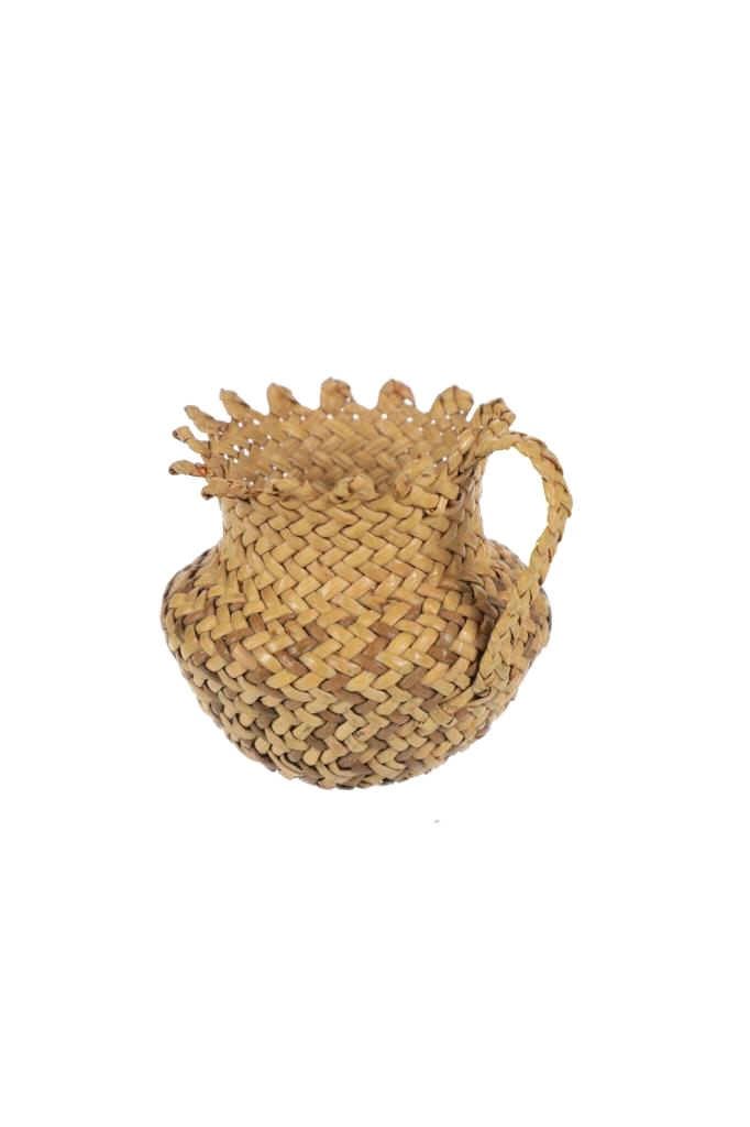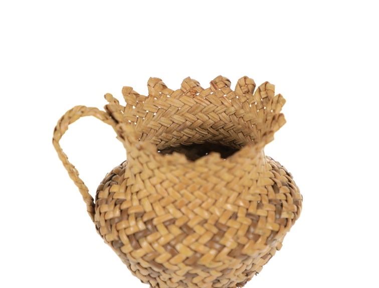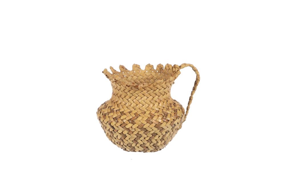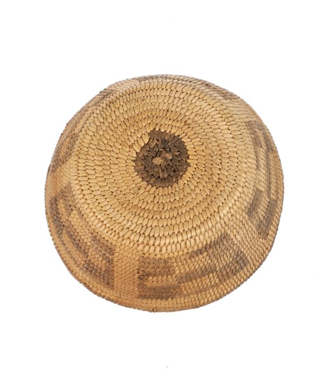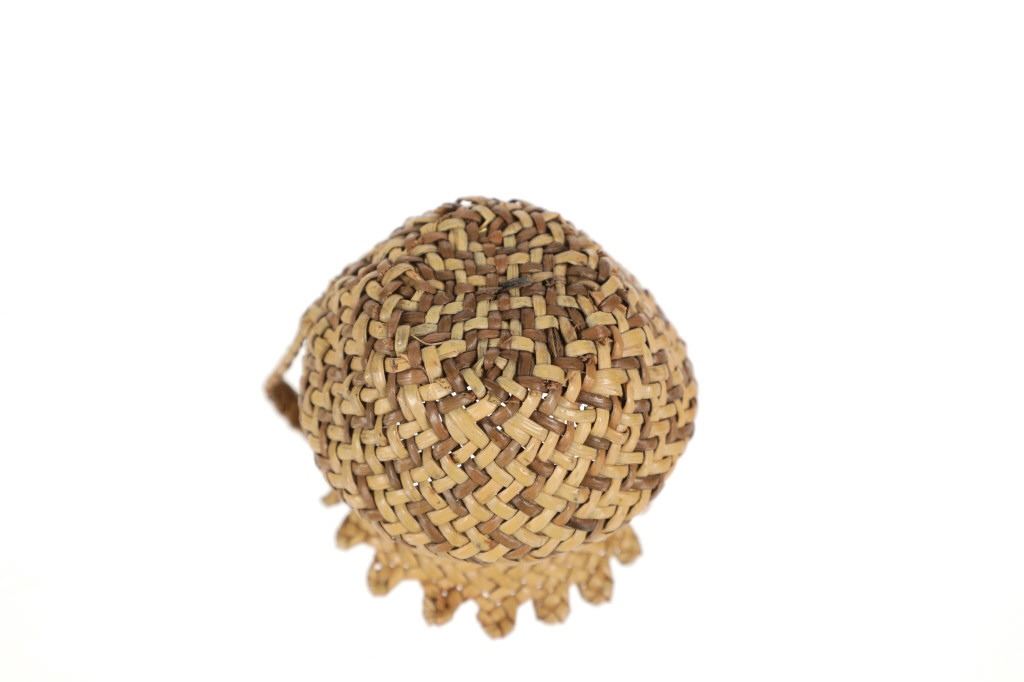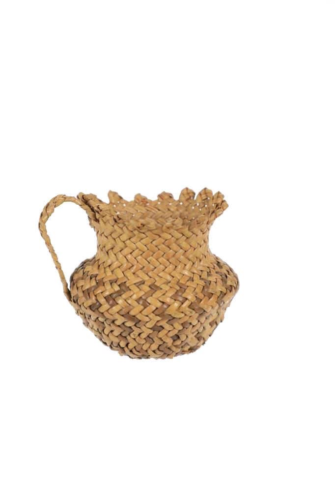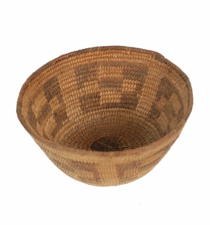 Featured in this lot is this Apache polychrome hand woven basket pair circa 1930's. There are two baskets in this collection. The first features a wonderfully and professionally crafted Devil's claw hand woven construction with polychrome geometric patterns woven into the side walling of the basket. The smaller basket is wonderfully and professionally hand woven Devil's Claw that shows polychrome decoration woven into the side walling of the baskets and shows a scalloped rim with a hand woven handle into the basket itself. The condition of these two baskets is good with no obvious signs of damage and shows good overall condition. The measurements of these baskets is 2 1/2" x 5 7/8" x 5 3/4" and 2 1/4" x 2 3/8" x 2 3/4".