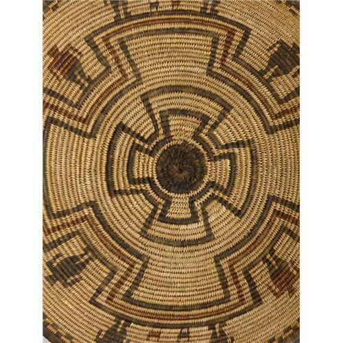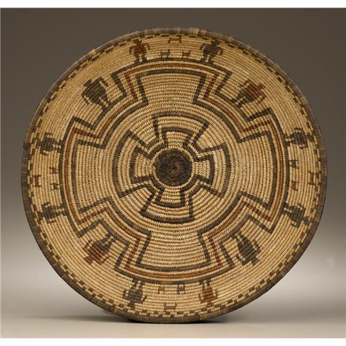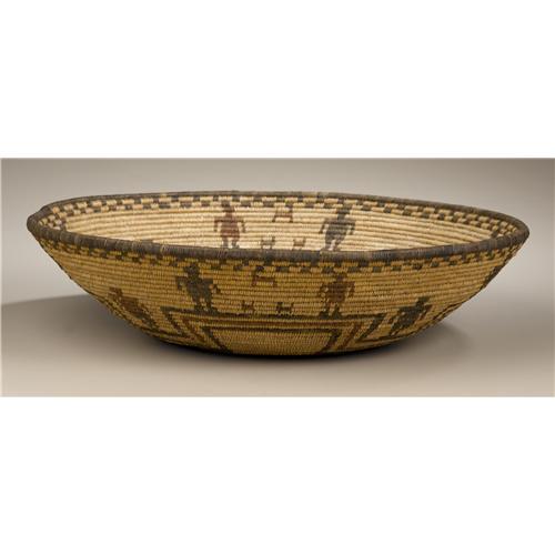 <B>Apache Polychrome Pictorial Bowl</B></I><BR>Circa 1910<BR>Height 4 in. Diameter 15 3/4 in.<BR><BR>This tightly coiled basket is decorated with a series of human figures and small quadrupeds in both black (devil's claw) and red (yucca root). The figures are posed standing upon a central castellated band. A pattern of small-checkered squares decorates the rim and a double outlined cross fills the bottom center.<BR><BR>Provenance<BR>Philip Garaway, Venice, California.<BR><BR>