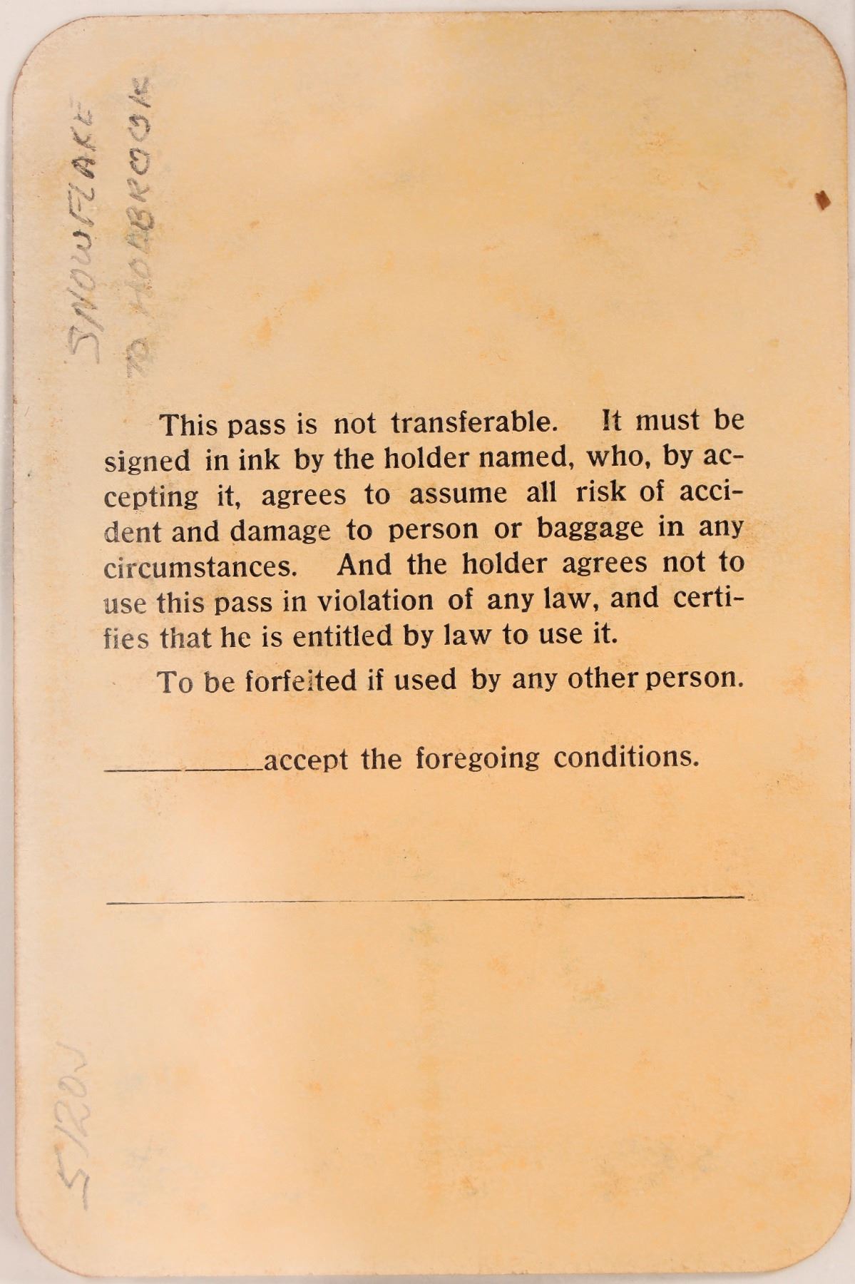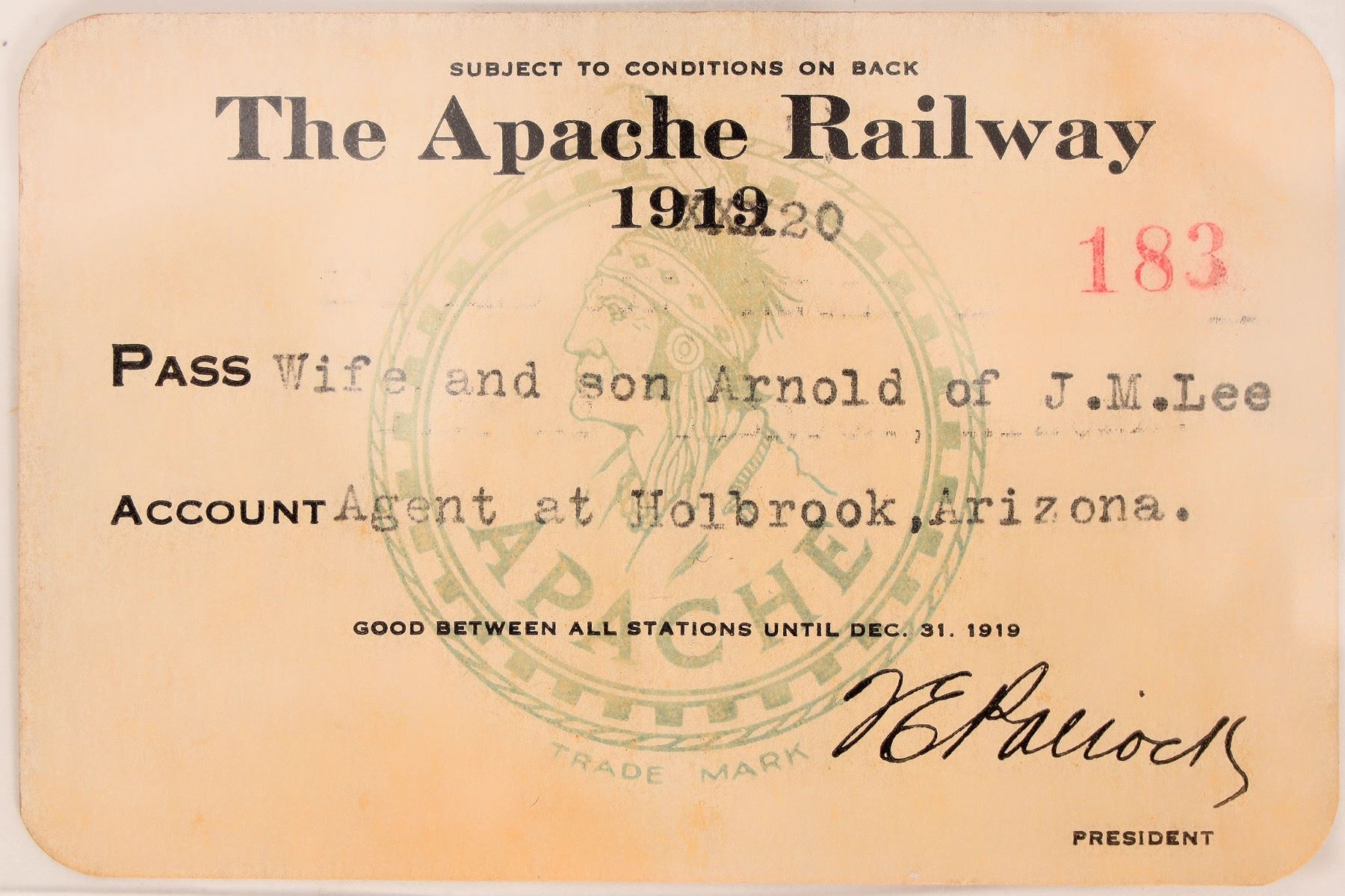 #183 issued 1919 to J M Lee, Good Between All Stations, signed pres. , tan card stock, company logo green underprint vignette center of pass, unk printer. Incorp 1917 short line RR running between Holbrook and Snowflake, AZ. Entered into bankruptcy 1923.