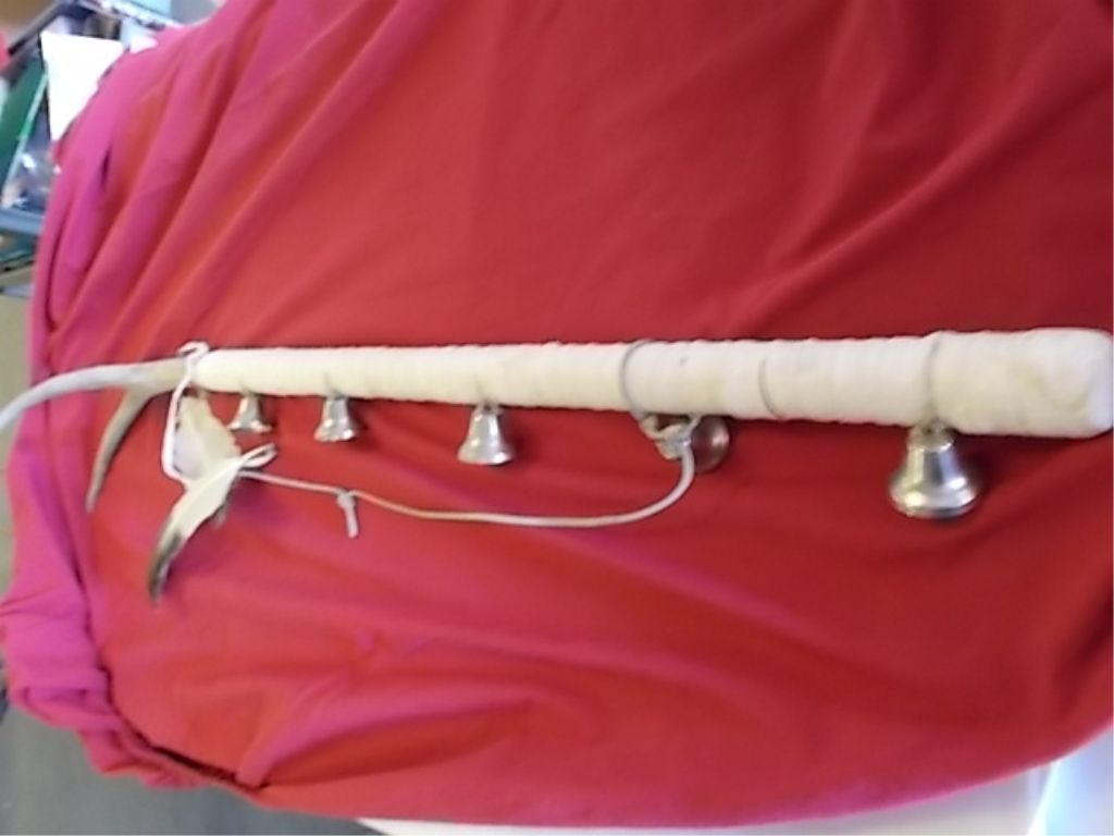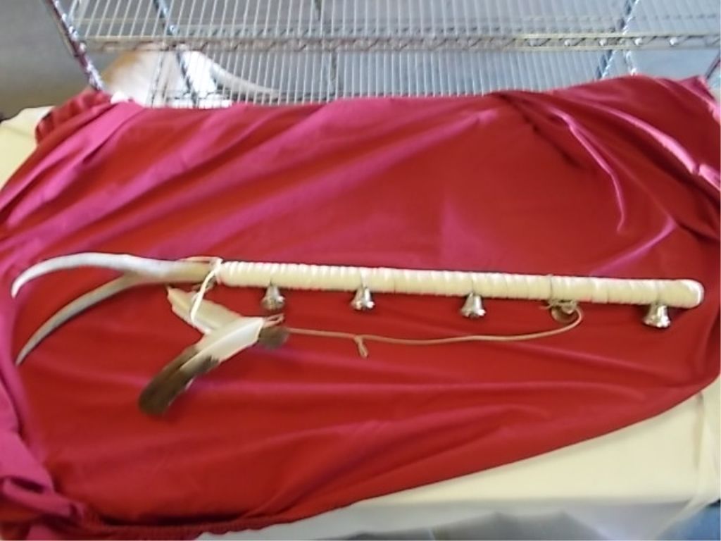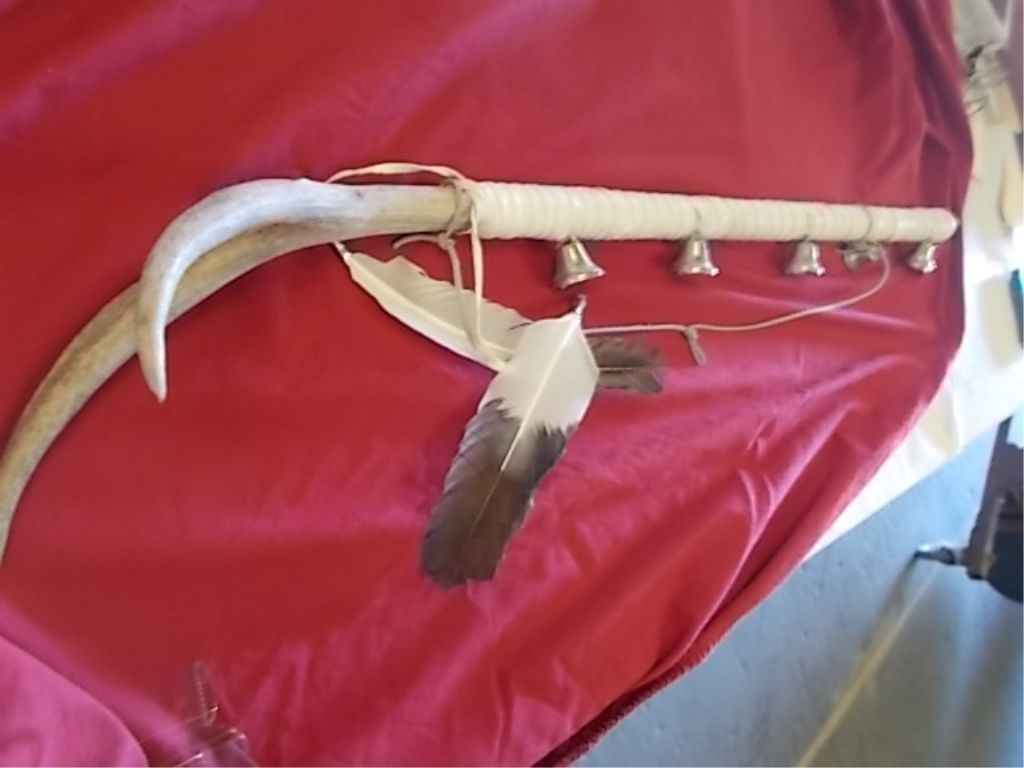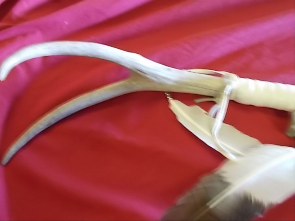 ’This is a nicely done 38” antler (5” point) collectible Apache ‘Spirit Stick’. Leather wrapped with two feathers and five bells. The ‘leather sling’ is just tied on for hanging as a display and easily removed.