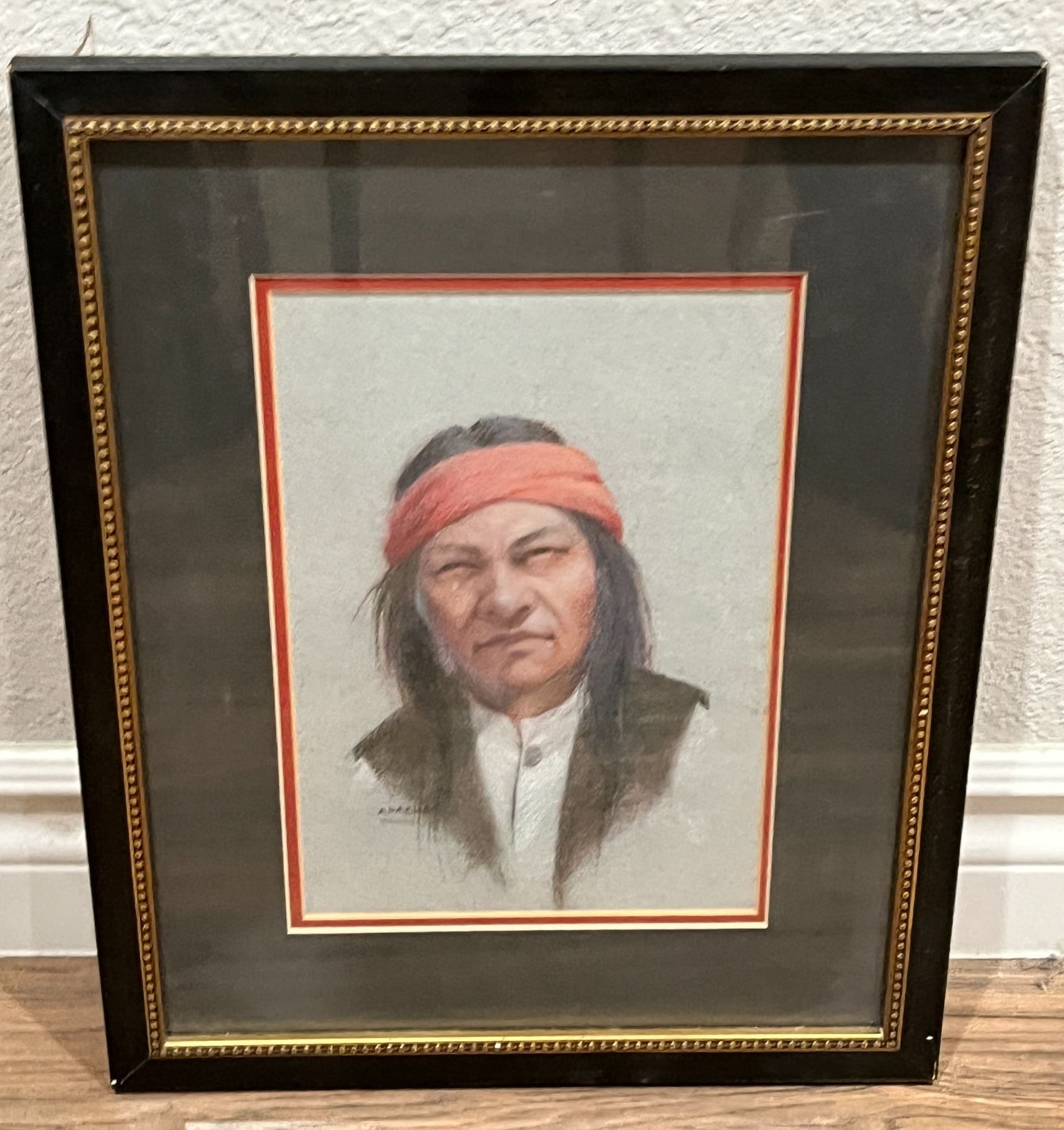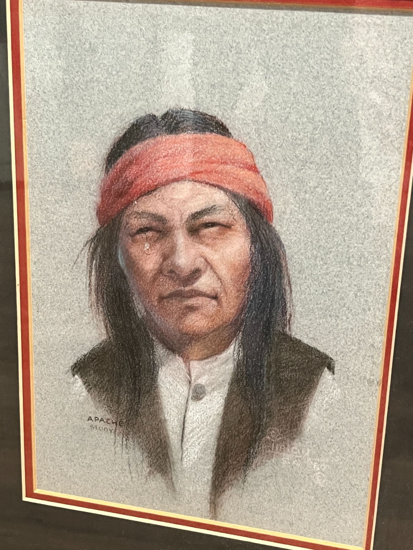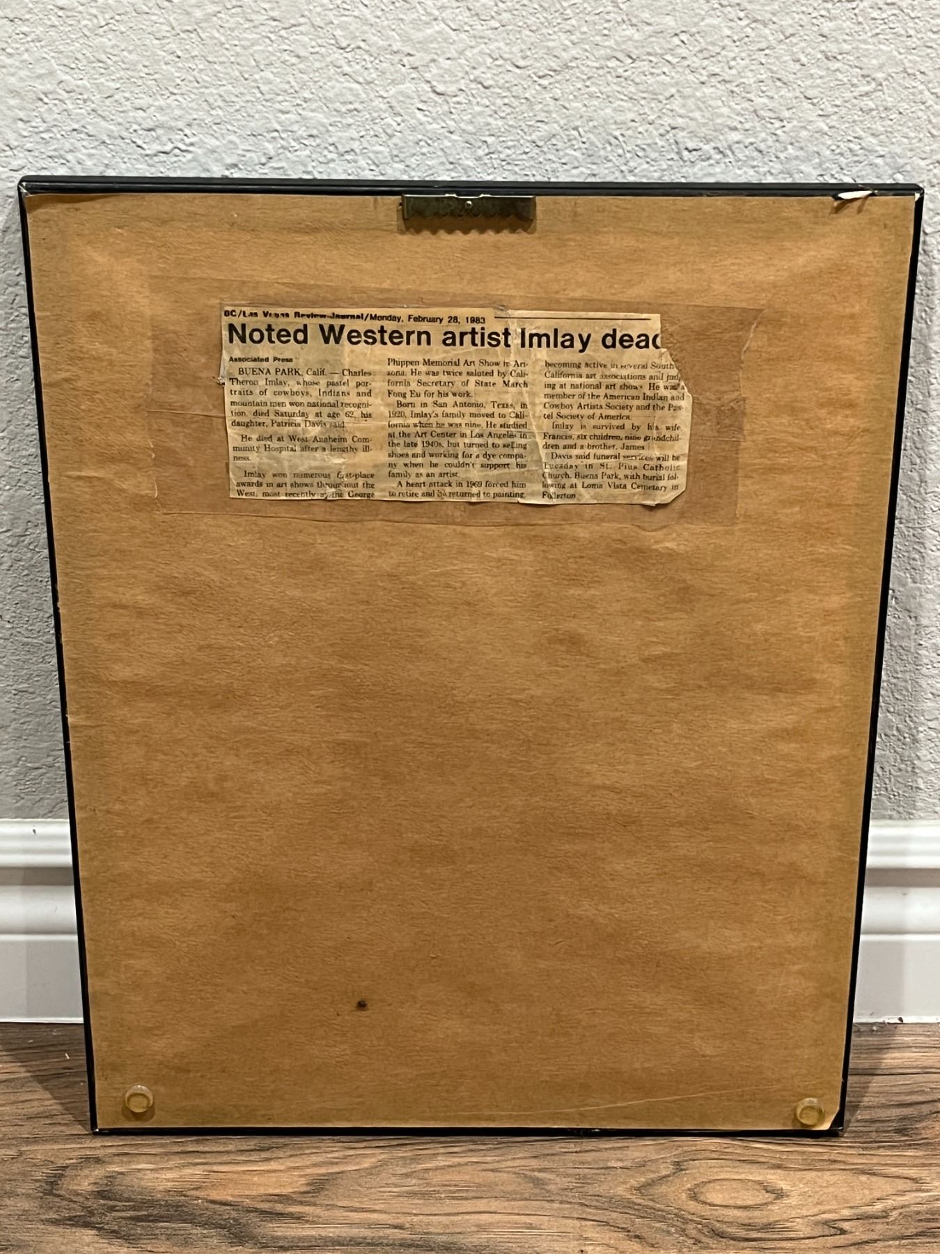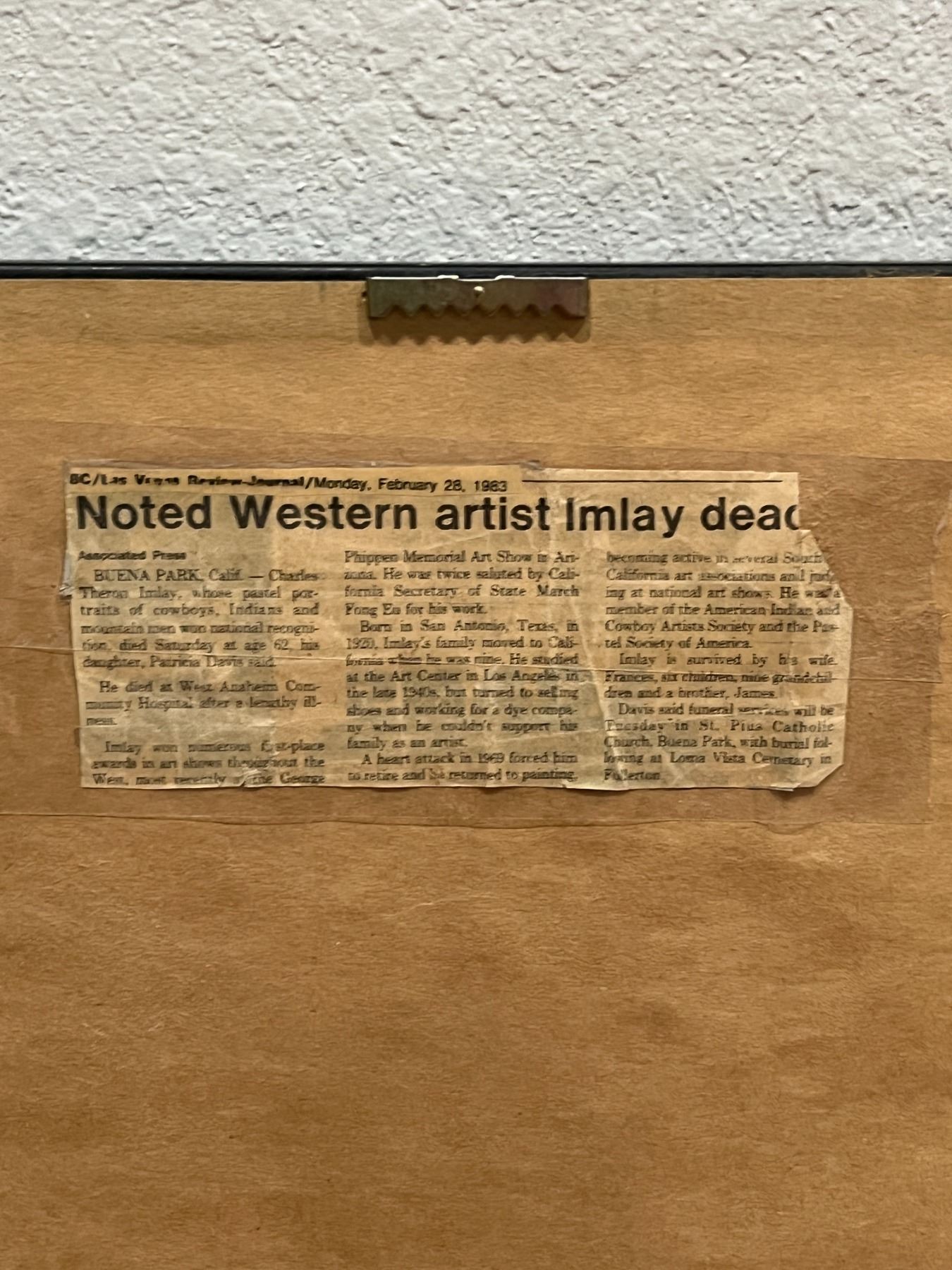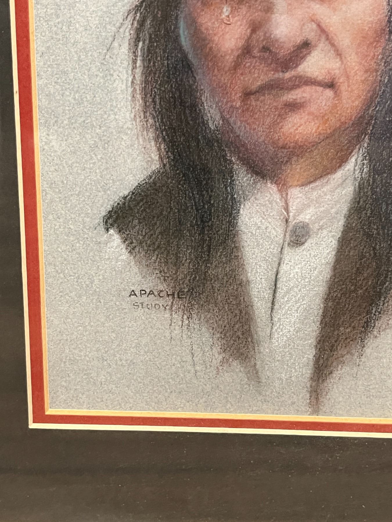 "Apache" Sioux: Charles Theron Imlay. Pastel Portait in Frame. With 1983 Newpaper article attached on the back related to the death of the artist. Approximately 15x13" in Frame.