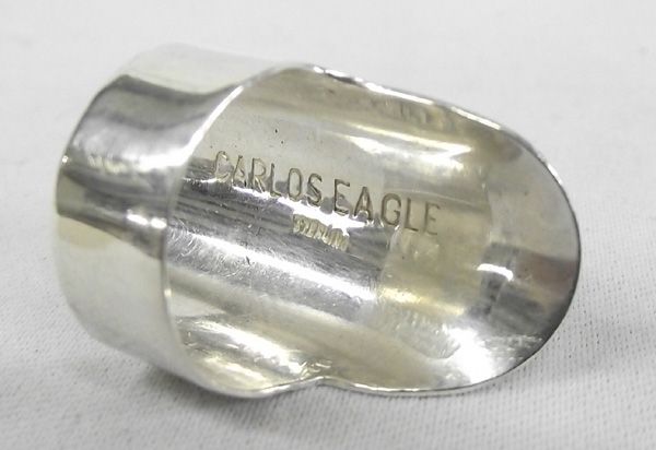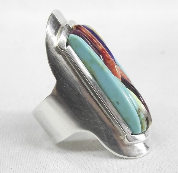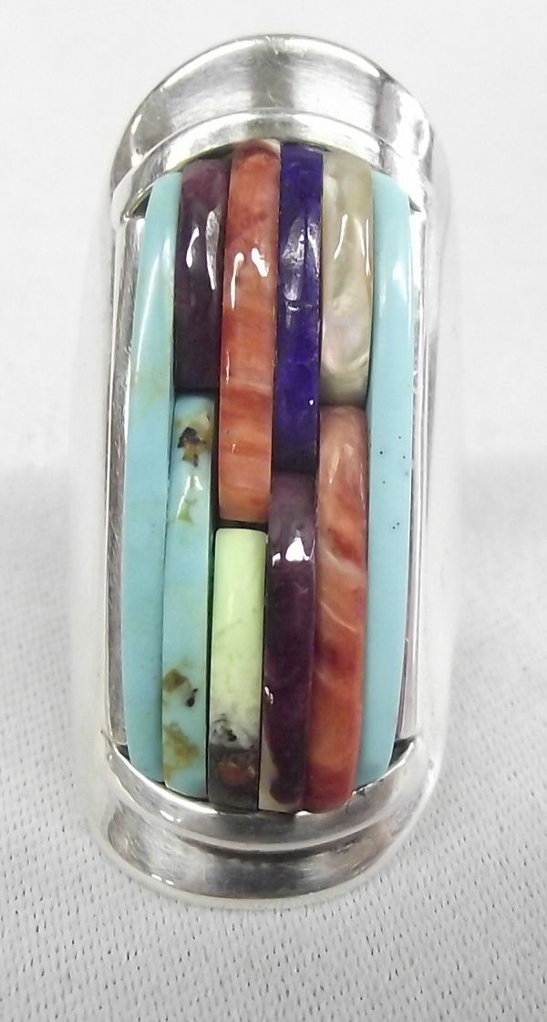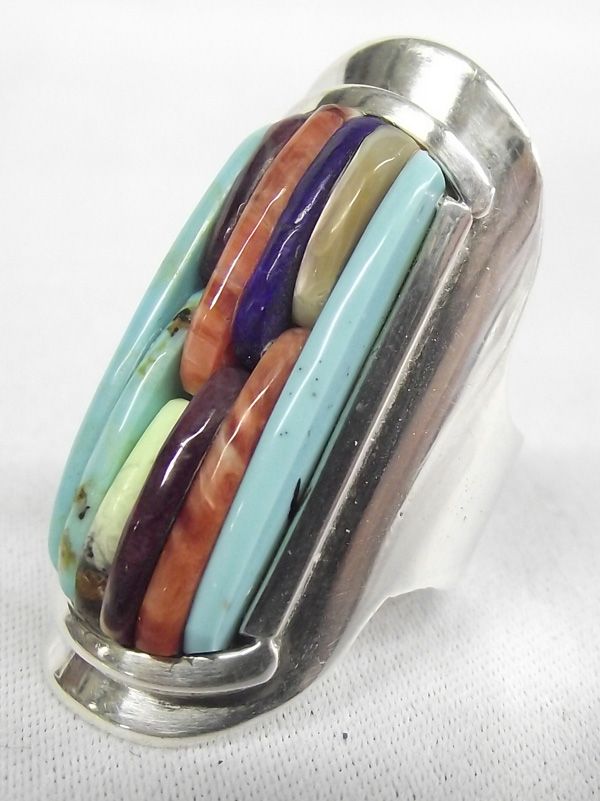 Apache Sterling Tower Inlay Ring - Carlos White Eagle (hallmarked Carlos Eagle) and stamped sterling, this stunningly beautiful ring features tower inlay of turquoise, coral, lapis, sugilite, and shell on sterling silver, size 7.25 and measures approx. 1 3/8''L x 5/8''W