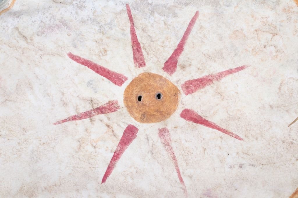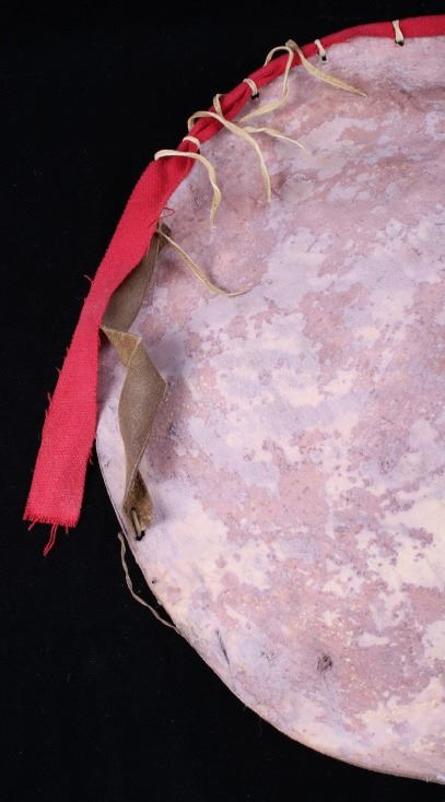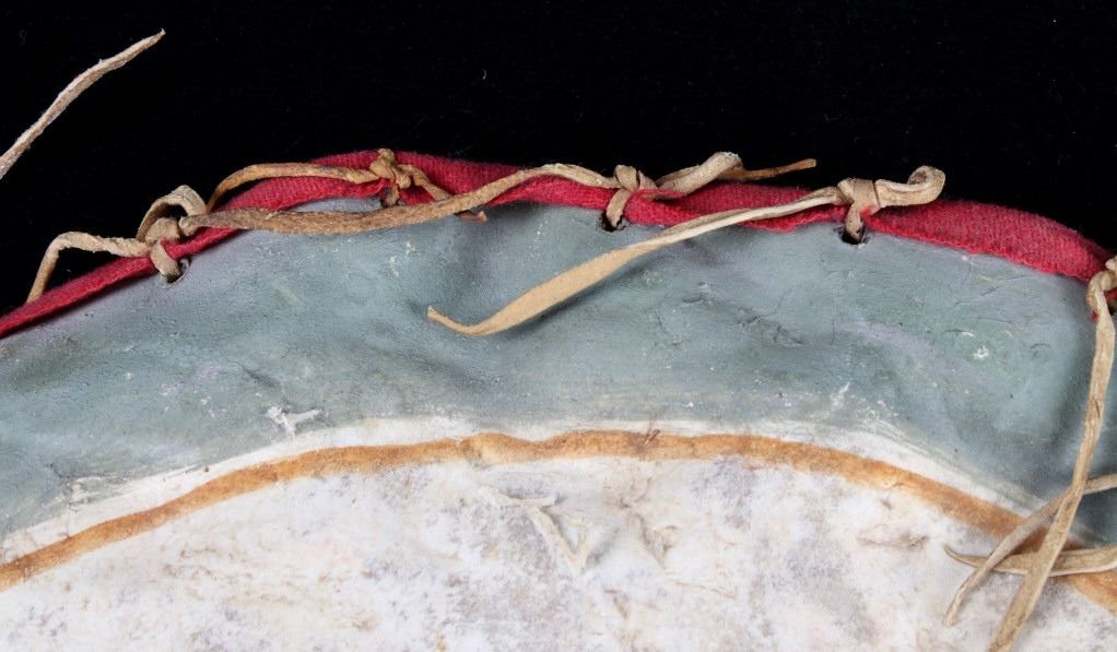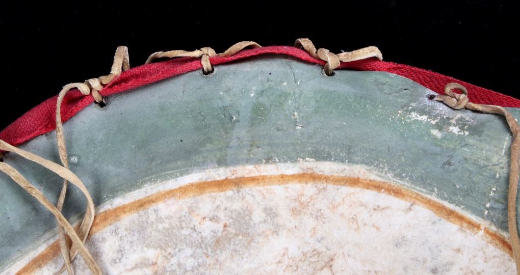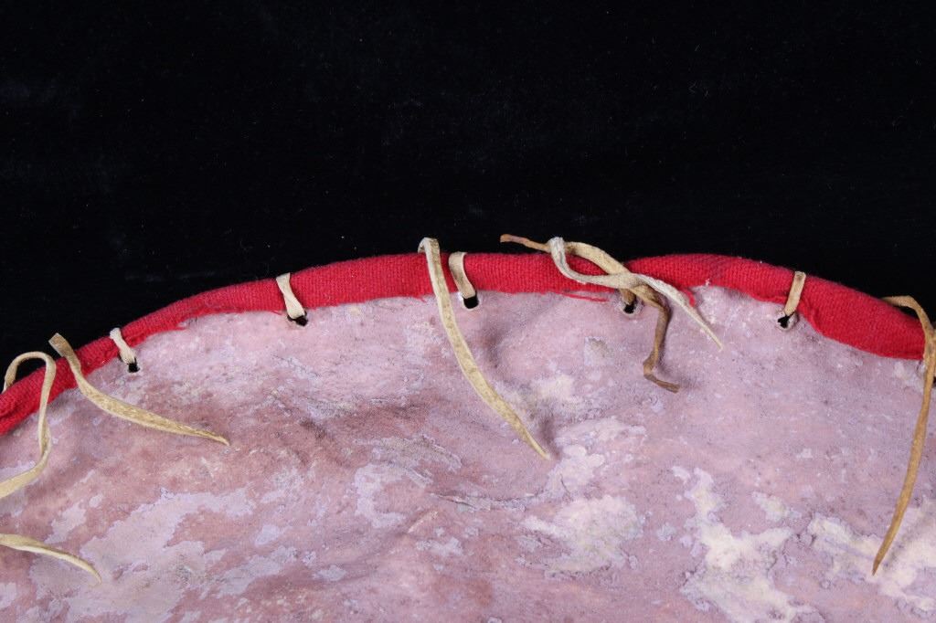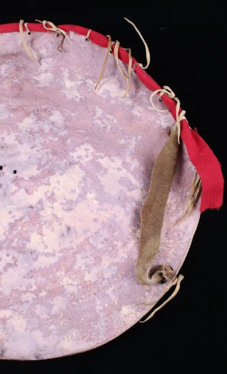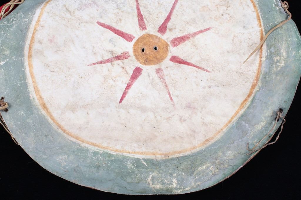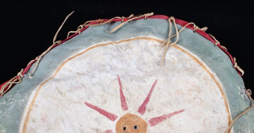 The lot features a parfleche polychrome painted war shield in the style and manner of the Apache Native American Indians. The shield is not thought to be of an authentic Native American heritage, but possibly could be of an older trading post age. Overall the piece shows a parfleche rawhide construction with polychrome mineral paint in a sun design of yellow, red and green ocher coloring. At the top shows a red clothe lining and rawhide sewing. The back shows a purple faded painted finish and two parfleche hide hand holds. The center shows two pierced holes which could have held a drop of feathers, possibly eagle feathers that were removed due to legality. Overall measures 16"x17.5".