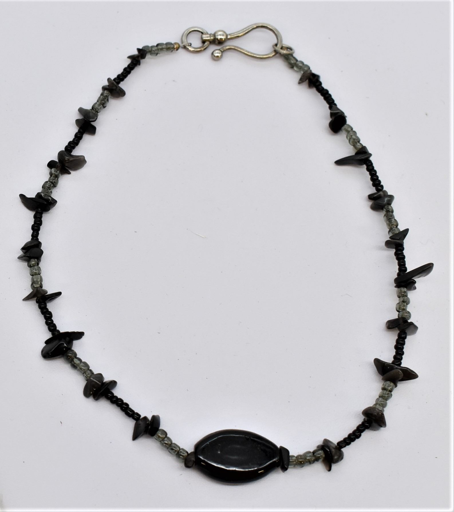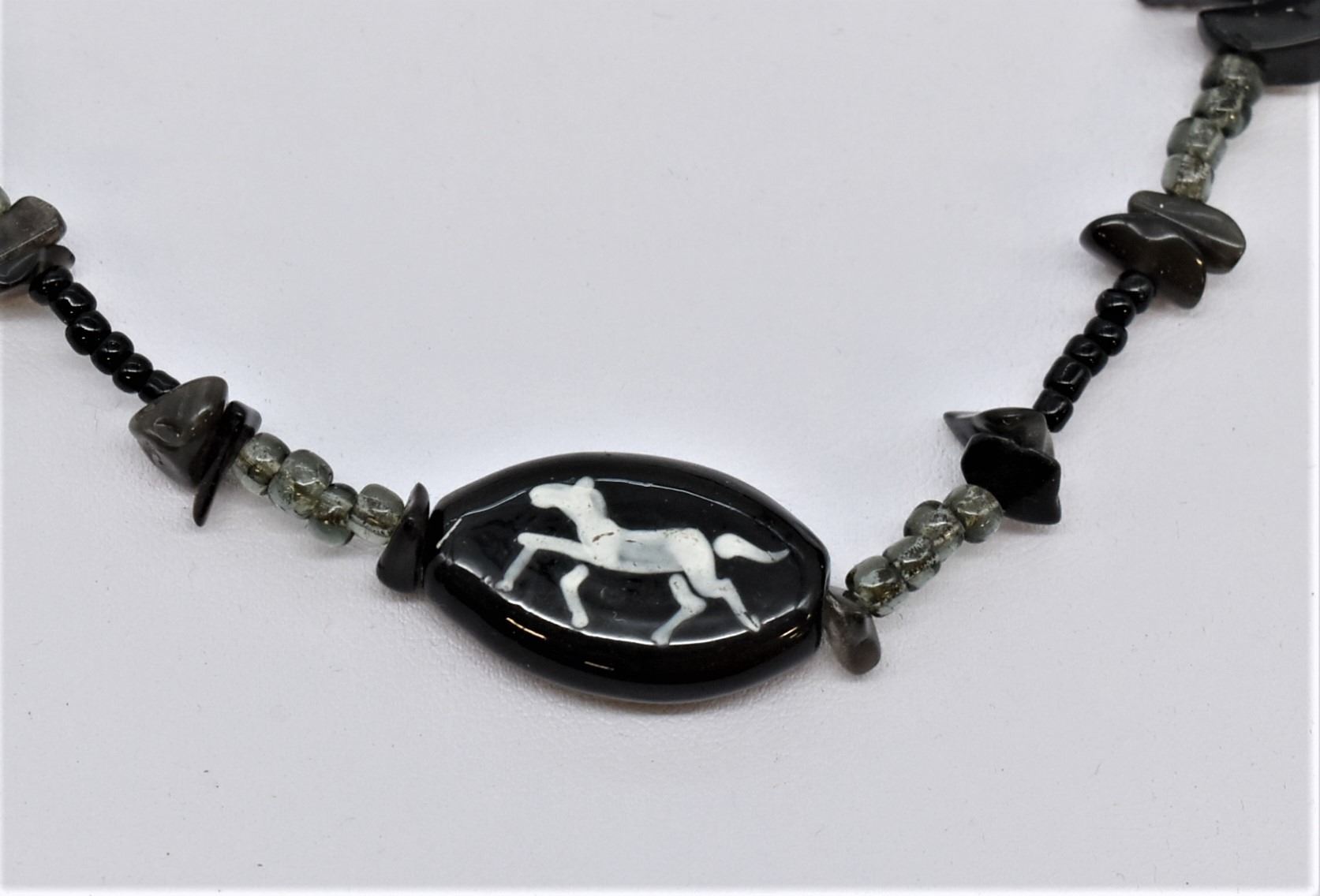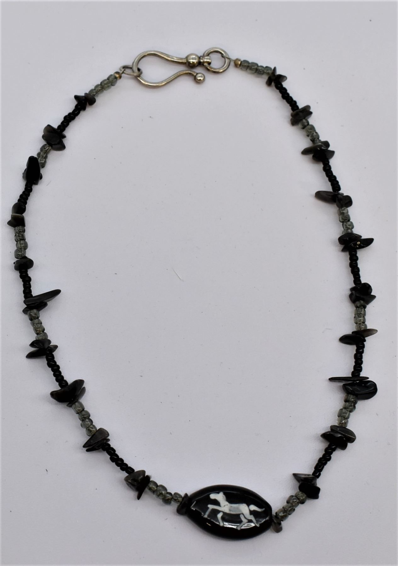 Apache Tear Nugget Horse Pendant Necklace, measures 18''L end to end, glass bead pendant measures 1'' x 5/8'', glass bead accents, hook and eye clasp closure