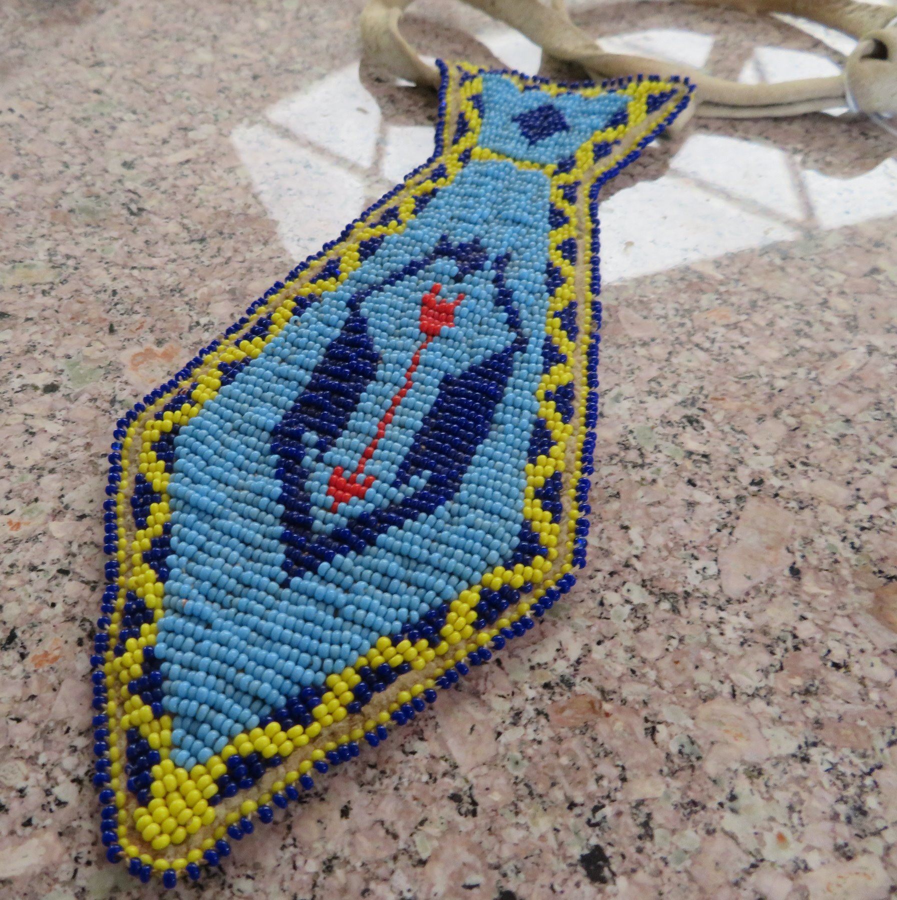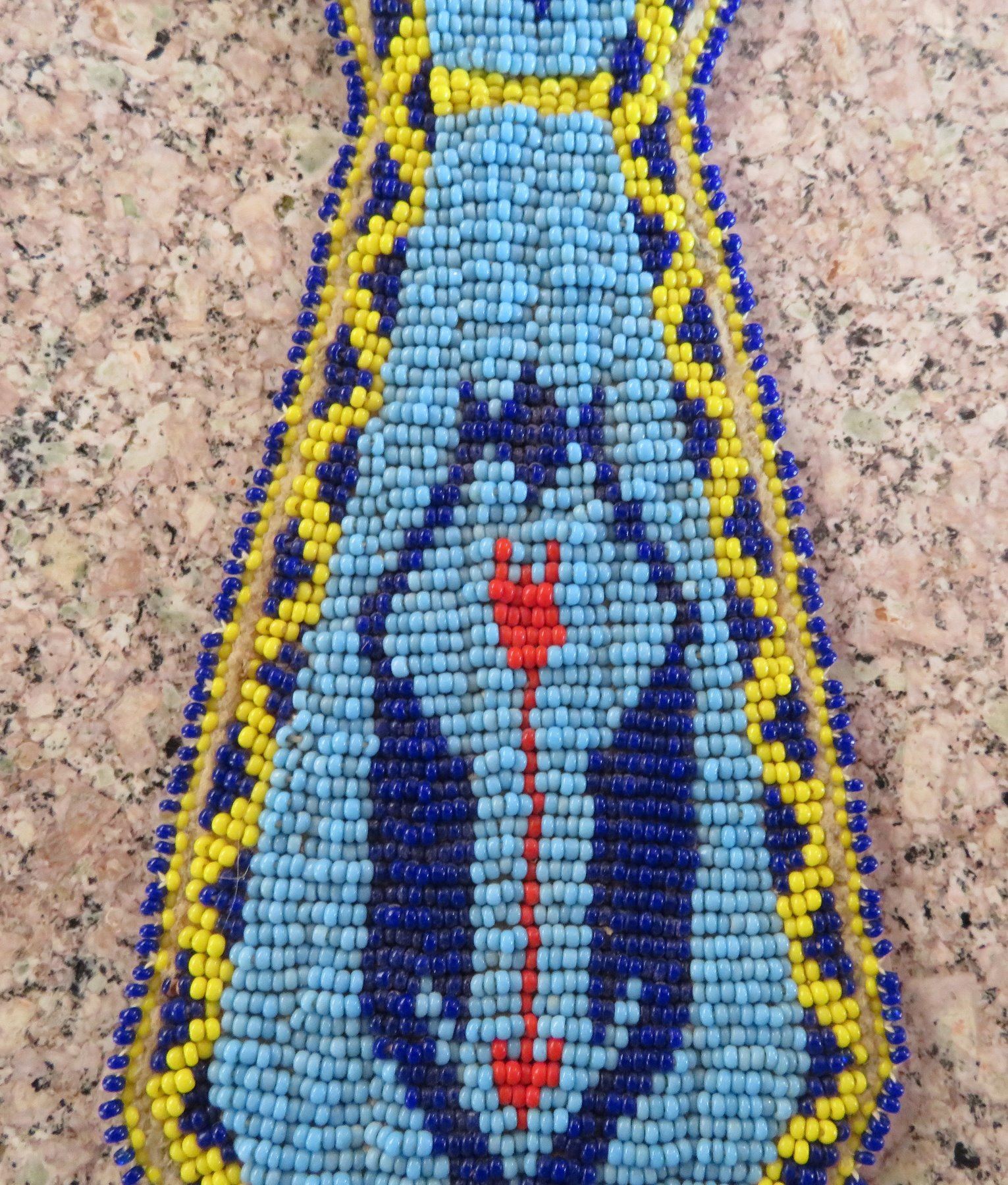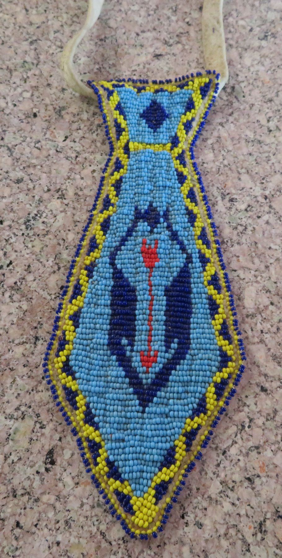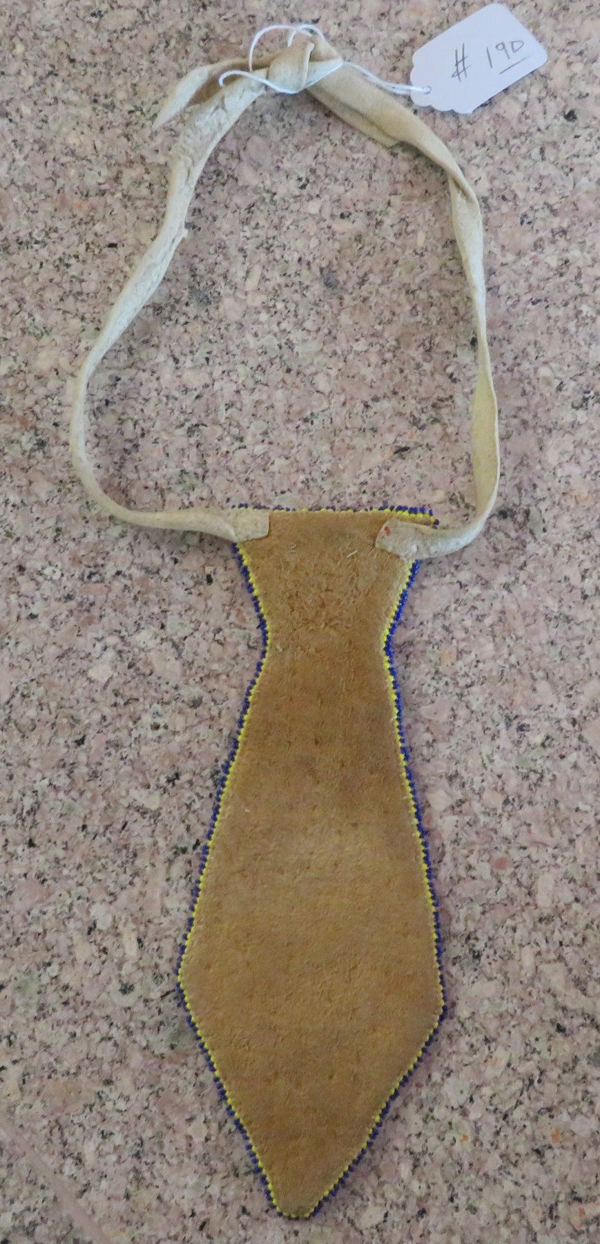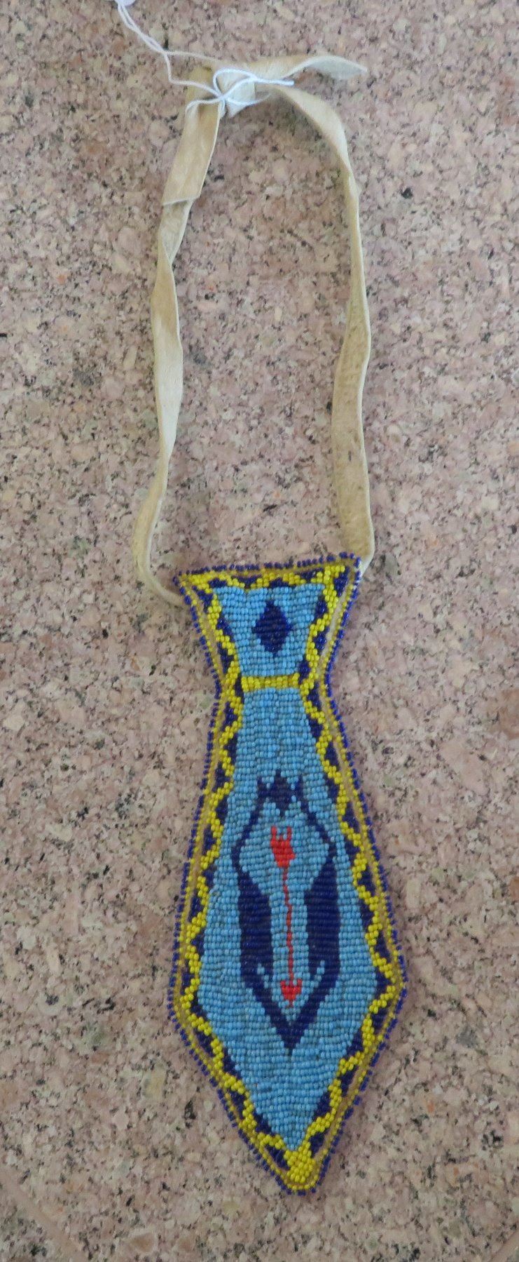 Apache Tie, c. 1940s. Made of deerhide and glass beads, the item measures 7 1/2" x 3" without laces. Apache. Arrow design, polychrome tie. Condition: Very good, see images. Shipping: $20.00 w/insurance and signature, due to value.