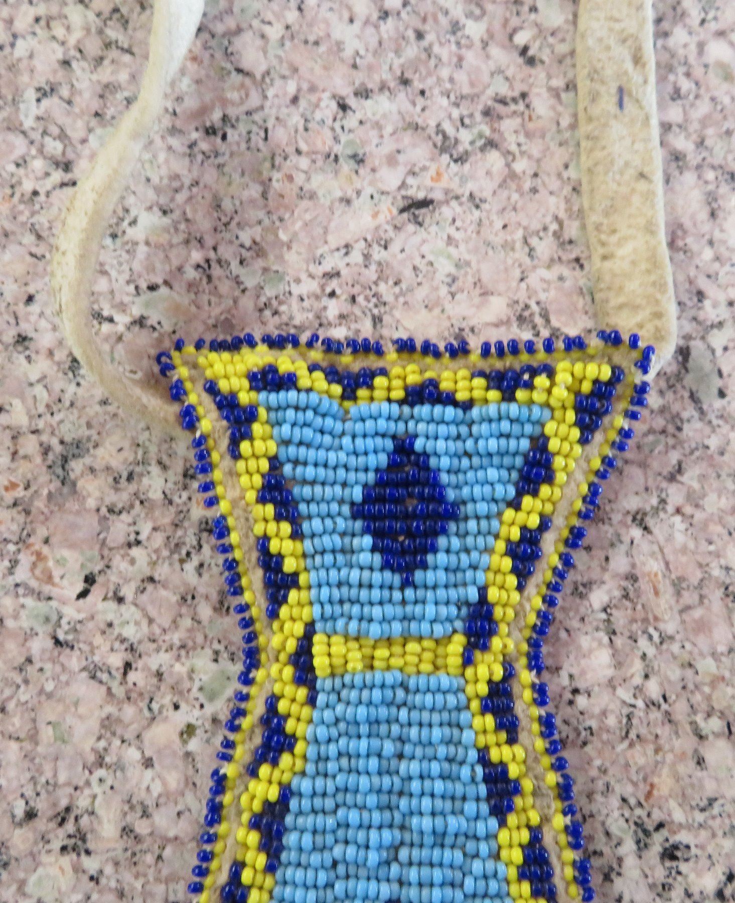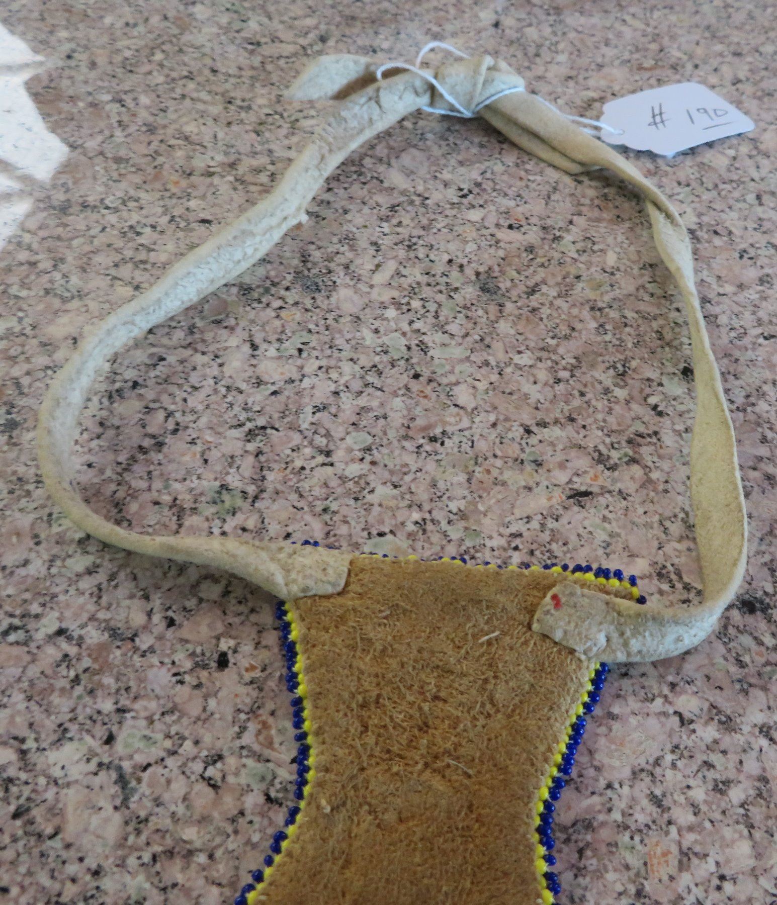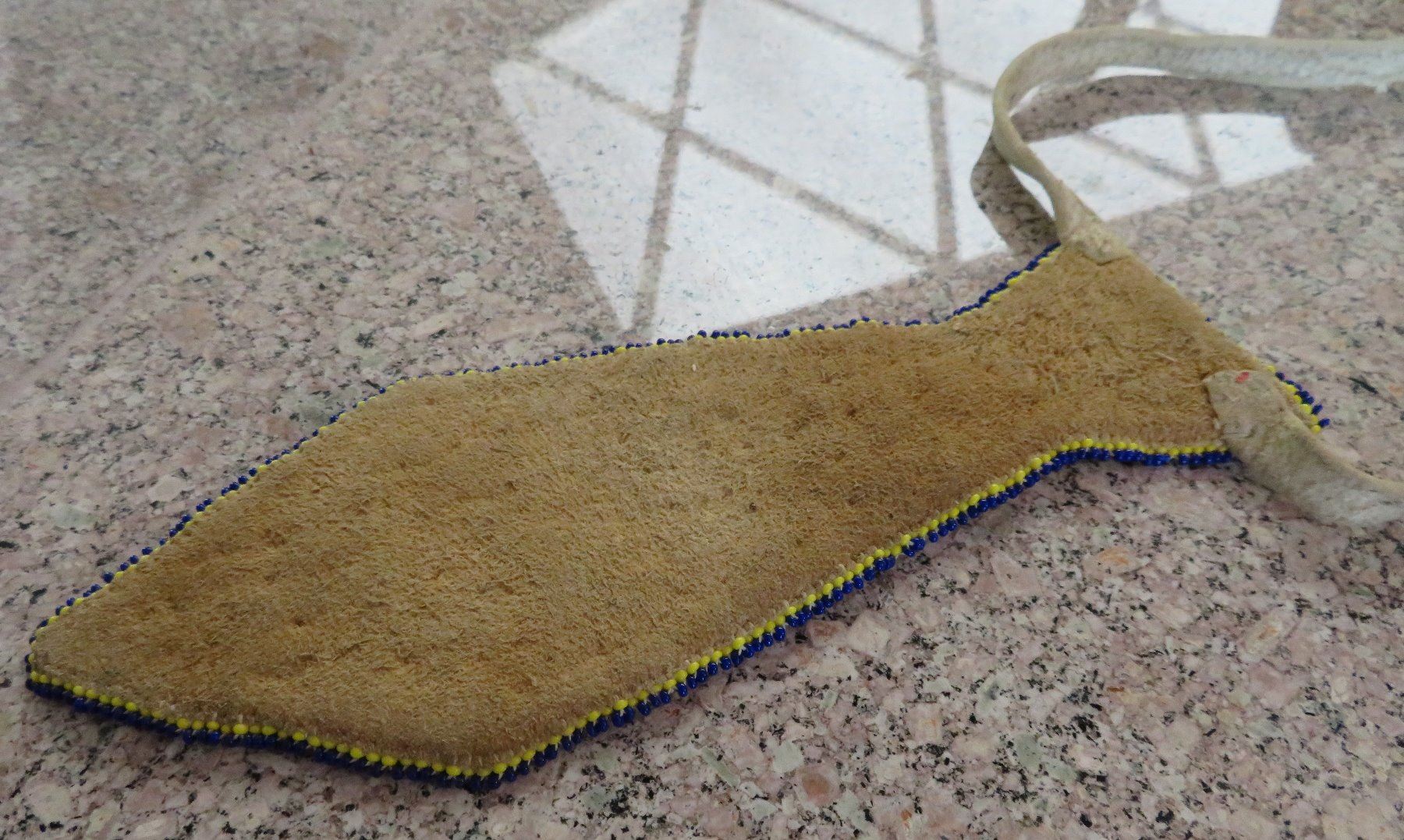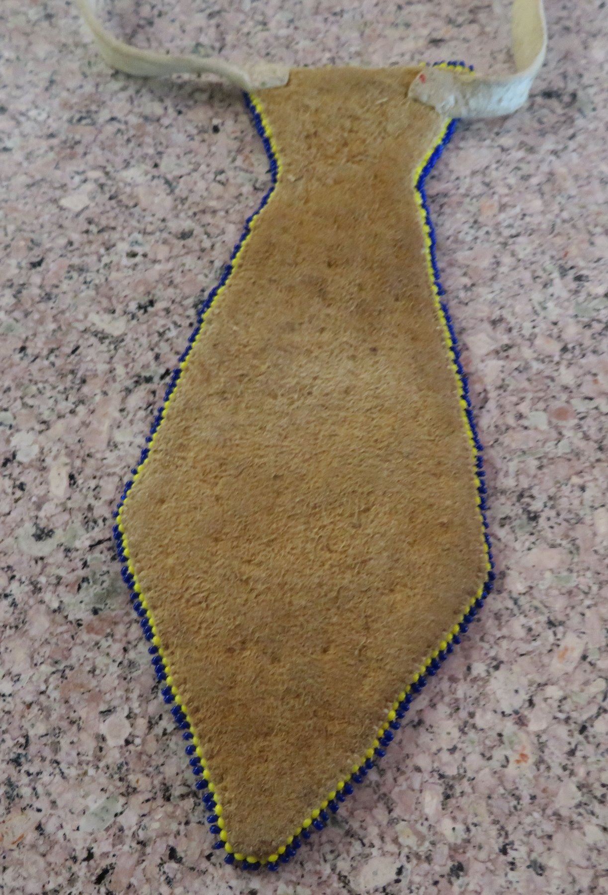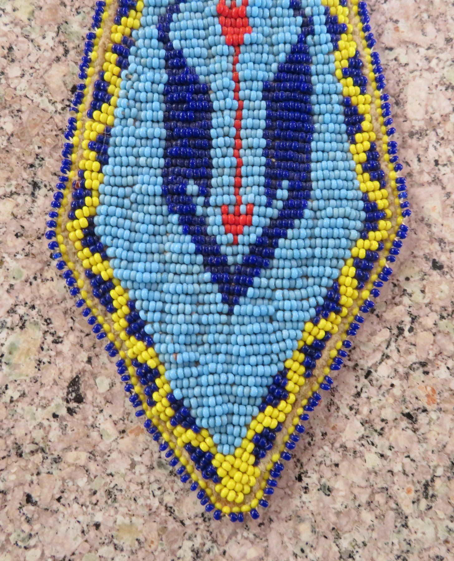 Apache Tie, c. 1940s. Made of deerhide and glass beads, the item measures 7 1/2" x 3" without laces. Apache. Arrow design, polychrome tie. Condition: Very good, see images. Shipping: $20.00 w/insurance and signature, due to value.