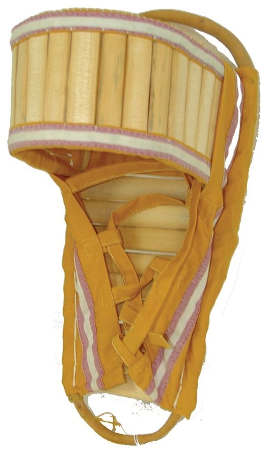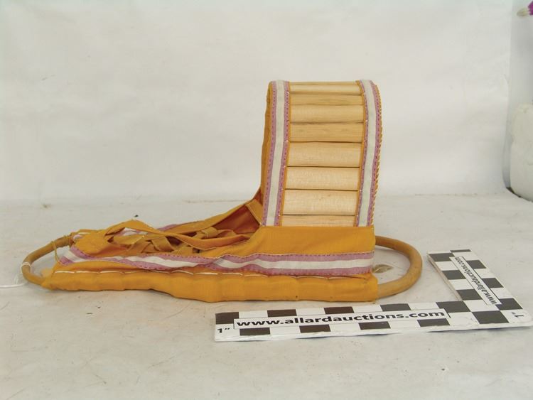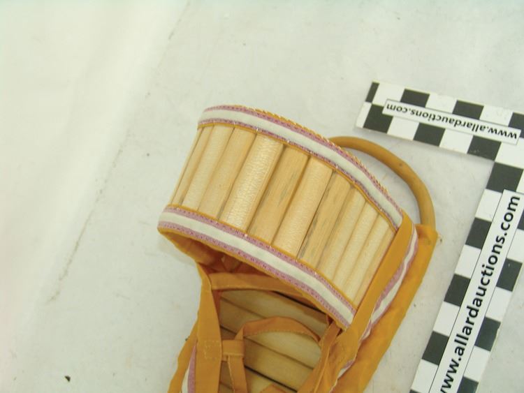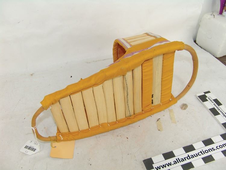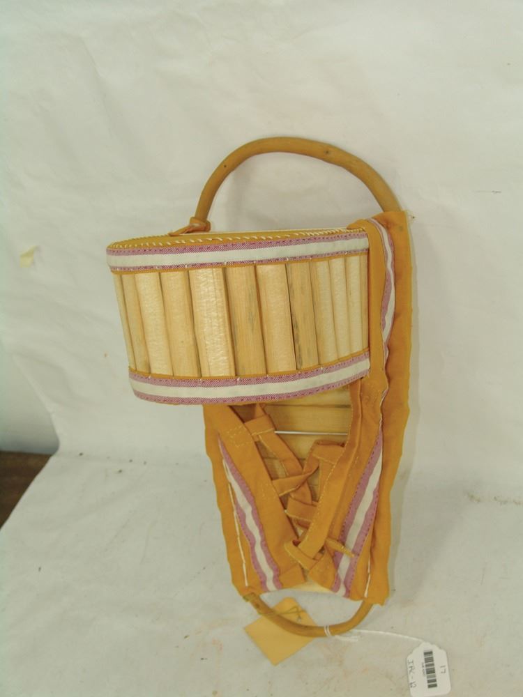Traditional mini baby carrier made from carved wood and bent willow and covered with yellow cloth. Very good condition.,Ca. 1970s,17" (BDWK)