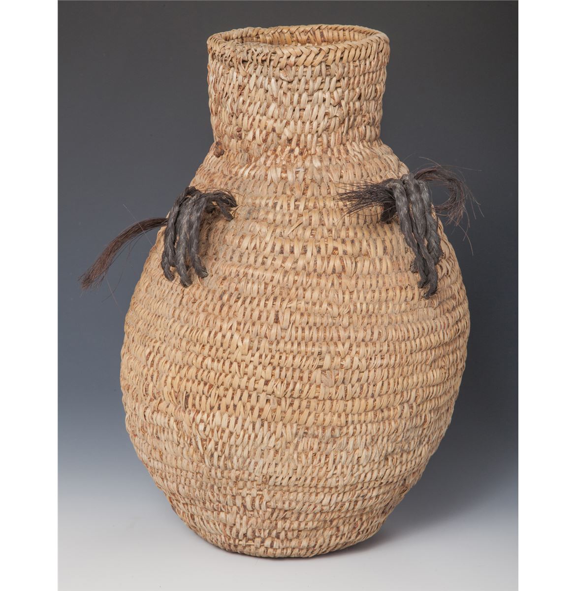 Apache Tus basketry canteen with horsehair handles. Crude construction of yucca over pine needle bundle. Interior shows traces of mud and pine resin. Circa first quarter 20th century. 12" x 8".
