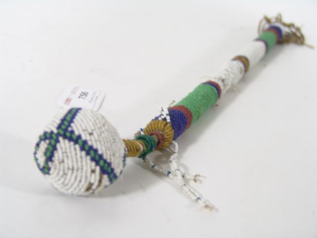 Circa 1900, Fully beaded flop-knob war club with hide covered wooden haft, all sinew sewn and beaded. 17"