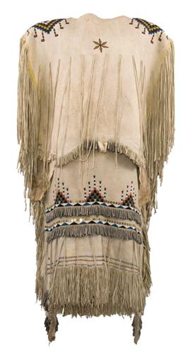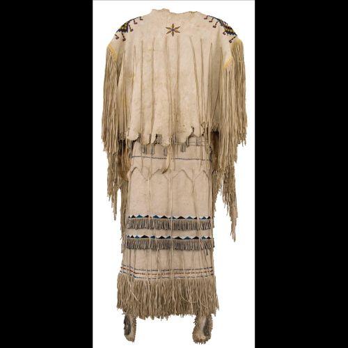 Apache Woman's Dress. 58" x 39". Indian tanned hide. Beautiful beadwork, fringe and hundreds of tin cones. 19th Century. (est $10,000-15,000)