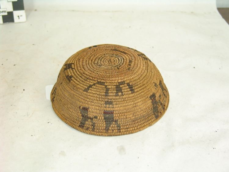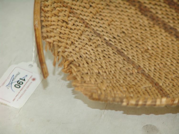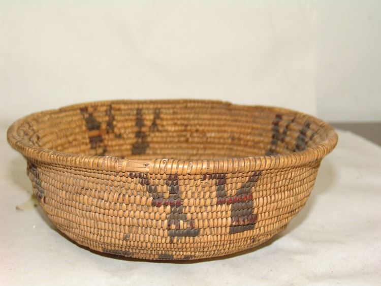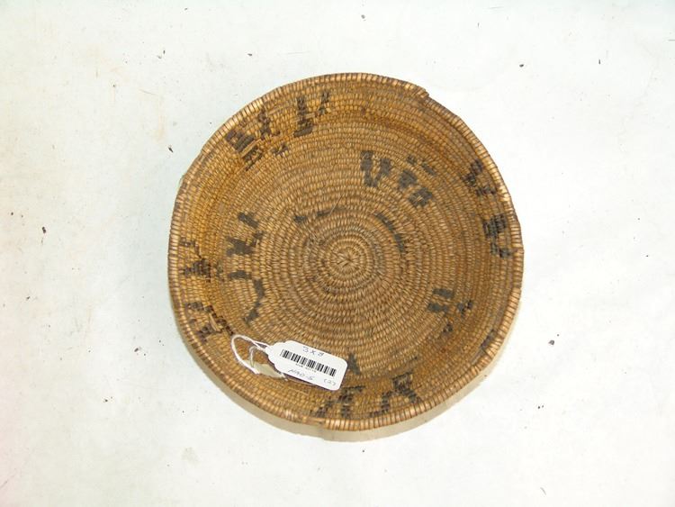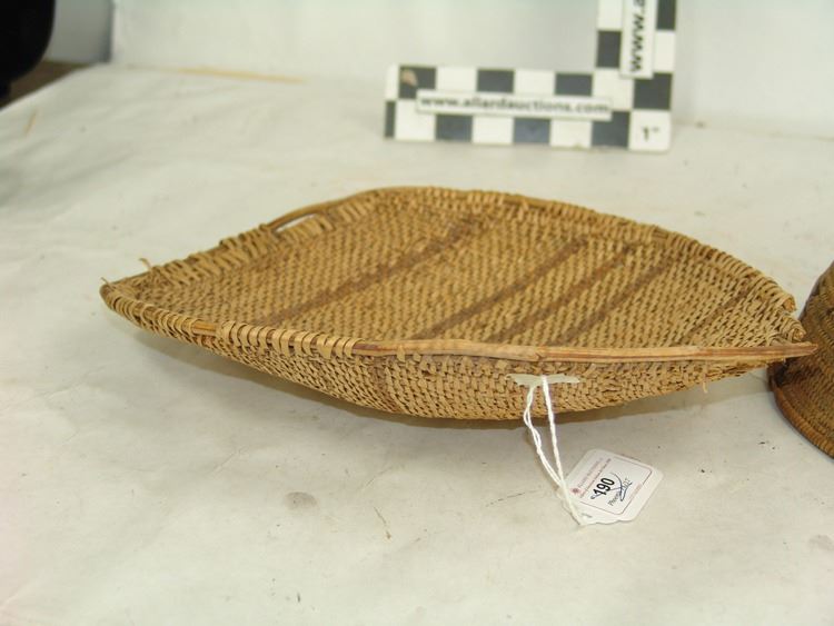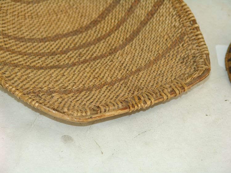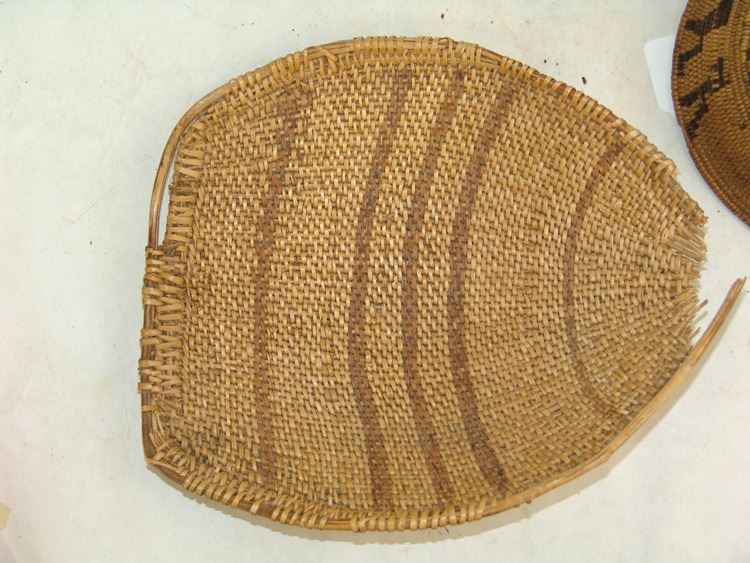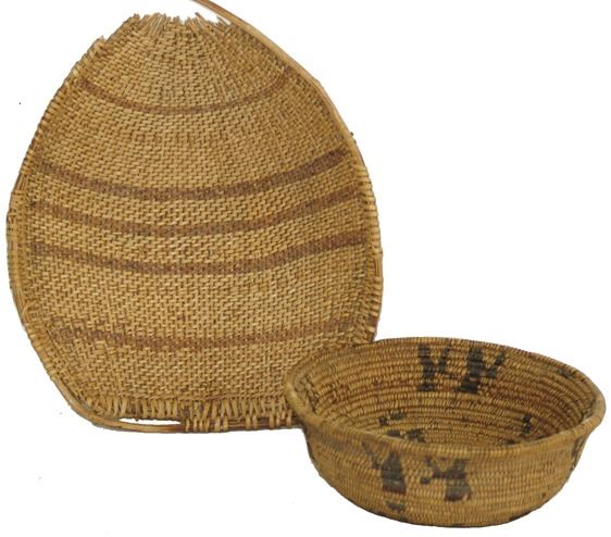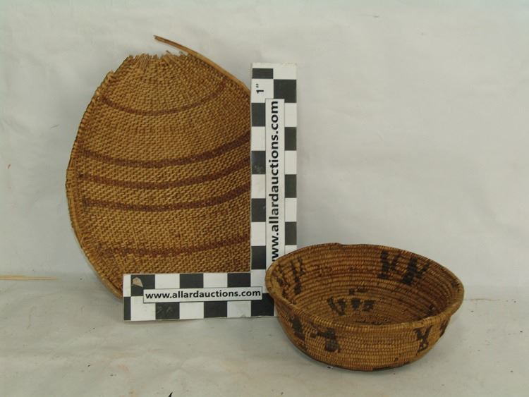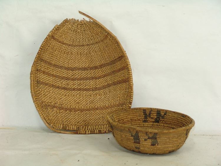 Includes a very old, well used Apache bowl with slightly flared rim and deer head(?) figure in good condition with a few missing stitches, plus an early Paiute winnowing tray with some damage to the tip and top.,Early 1900s,11-1/2" x 9-1/2" x 2-3/8", 3" x 8"
