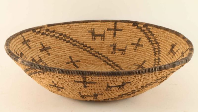 Shallow bowl with swirl, cross and animal designs. Measures 14"x3 1/2". Good condition