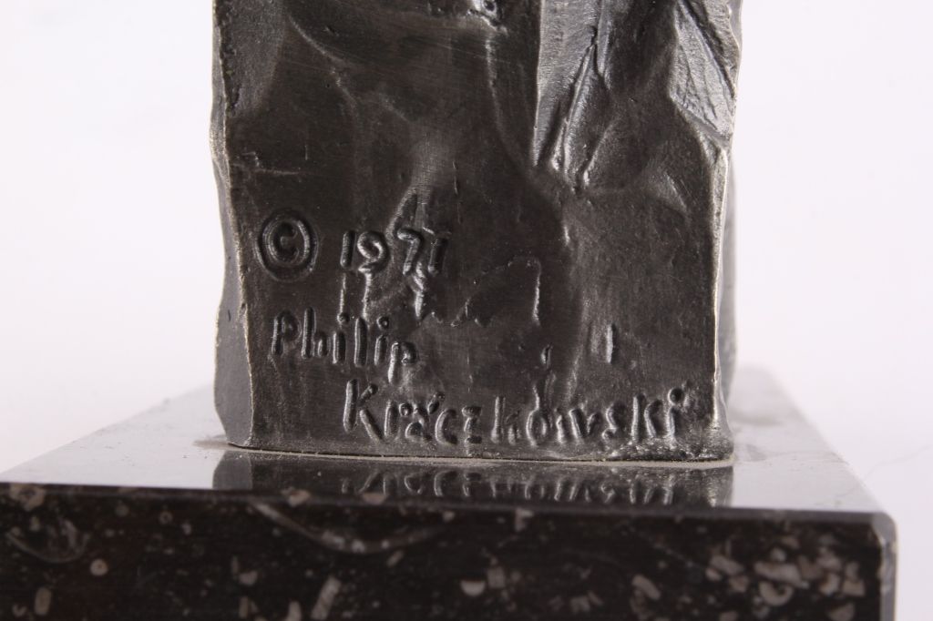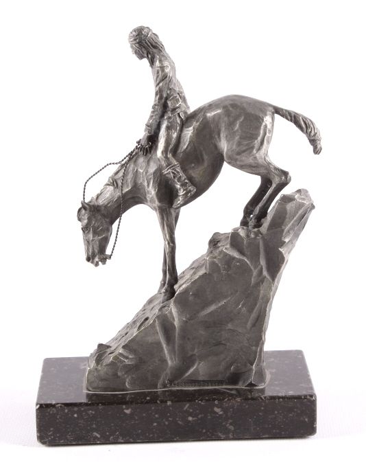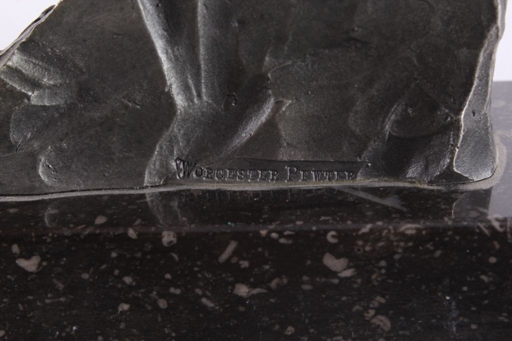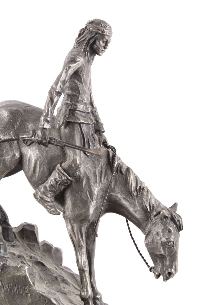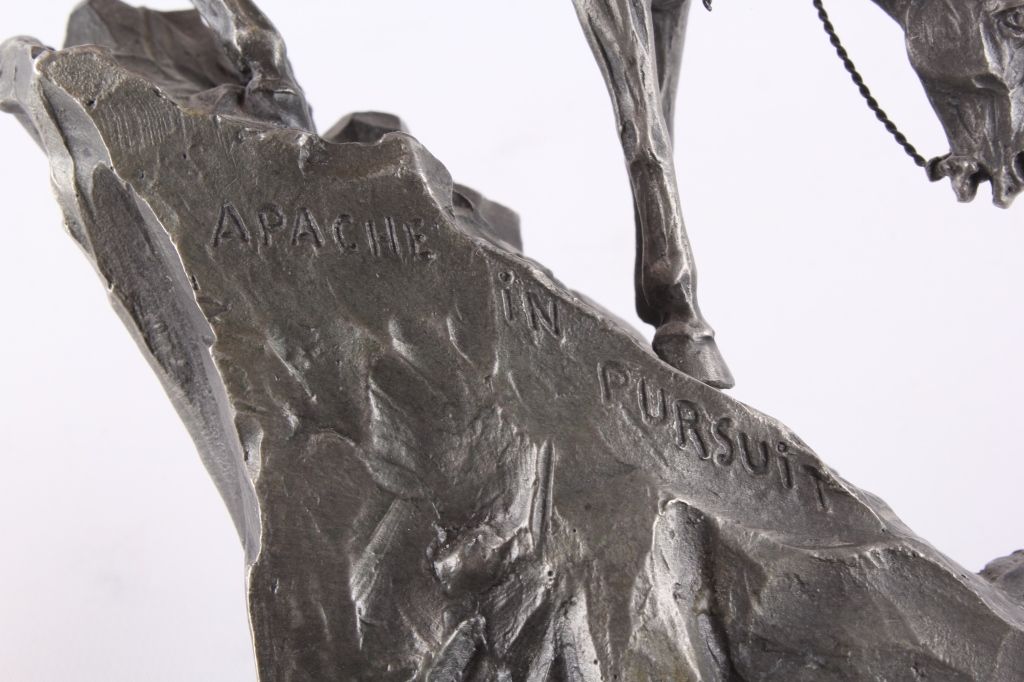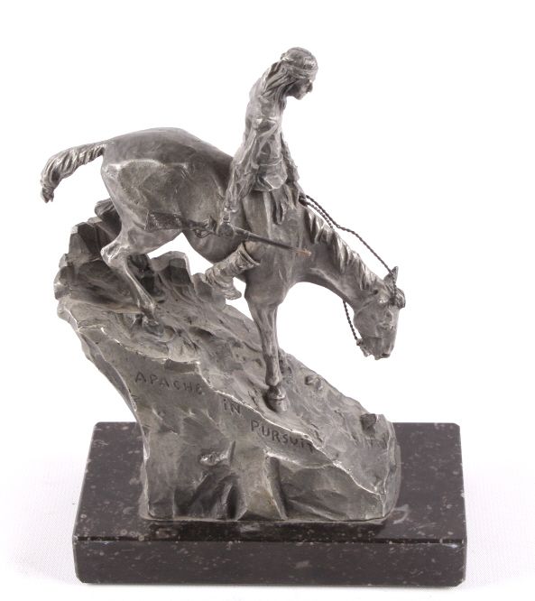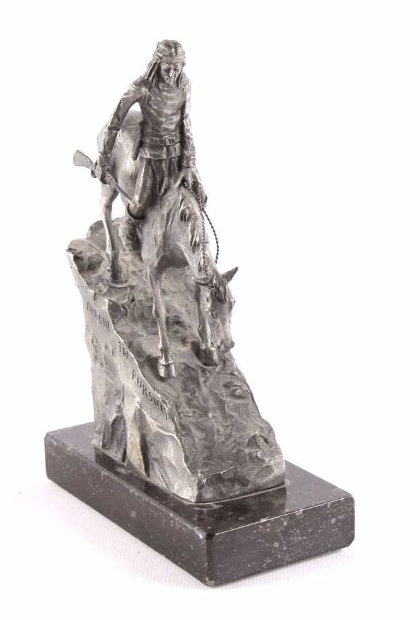 This is an original cast Worcester Pewter sculpture by Philip Kraczkowski 1971 named, "Apache in Pursuit". The piece shows a horse back Apache Native American Indian riding down a steep terrain. On marble. Measures 2.5"x5 1/8"x7.5"