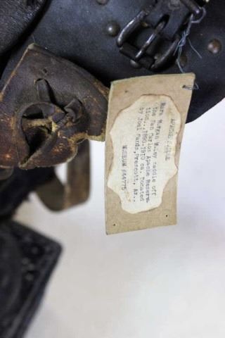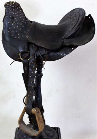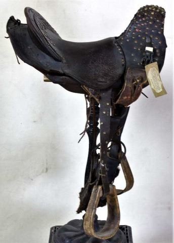 Apache tacked Morgan Muley saddlewith old attached museum tag reading "Apache Saddle Rare Morgan Muley Saddle off the San Carlos Apache Reservation...1890-1910 Ca., Donated by Joel Sands, Prescott, Ar. Museum #44775." saddle is in very good completecondition, the inside back of seat spelled out "Apache" in brass tacks, the tree tacked in random pattern of brass and painted, additional brass tacks around rear of skirt, front seat, and stirrups, period oak oxbowstirrups show great wear and patina, the horsehair cinch intact, descended down to North Dakota family. Est. 750-1500