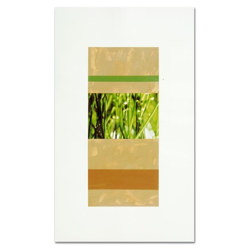 "Aperture" is an original mixed media painting on paper by Liz Rider, hand signed by the artist. Includes Letter of Authenticity. Measures approx. 27" x 44" (border), 12" x 28" (image). There is a 6" vertical crease that appears to be a tear at the top of the white border that will be removed when the oversized border is trimmed and the piece is framed.