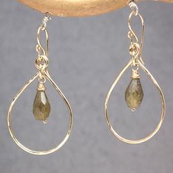 Metal: SilverHammered drop hoops with idocrase, about 1-3/4".Available in either 14K gold-filled, rose gold-filled, or sterling silver. All jewelry is entirely handmade in our studio in New York.