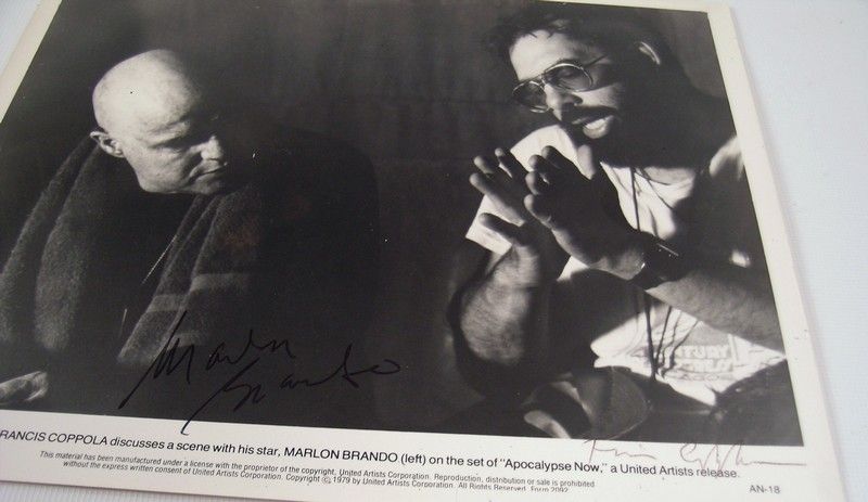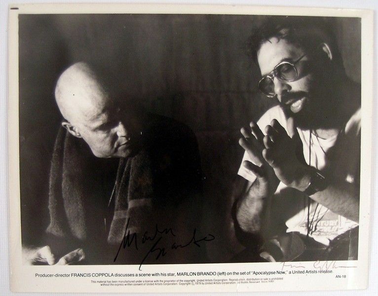 The production of Francis Ford Coppola's astonishing masterpiece "Apocalypse Now" (1979) was so filled with mishaps, delays, heart attacks by several of the stars, storms, political uprisings, emotional and internal conflicts, and financial nightmares, not to mention the astronomical amount of time it took to both shoot and finish, it is one of the miracles of cinema that it saw the light of theater screen at all, and more important that in turn it became one of the greatest American films ever produced. The glue that held this epic together was, of course, the character of Colonel Walter E. Kurtz played by Marlon Brando. Even though he's only seen in the last act of this nearly three hour movie, he permeates the entire film, and his performance is one of the most haunting and unforgettable ever created. And during filming, he literally almost drove Coppola to suicide! That is what makes this autographed official studio publicity photo so collectable. It shows Copolla directing Brando in his famous first appearance in the film. And best yet, it is personally signed by both Marlon Brando and Francis Coppola. It comes with both a COA and a Letter of Provenience from Anahid Nazarian, who was Coppola's librarian and assistant. Photo is B&W and 8x10".