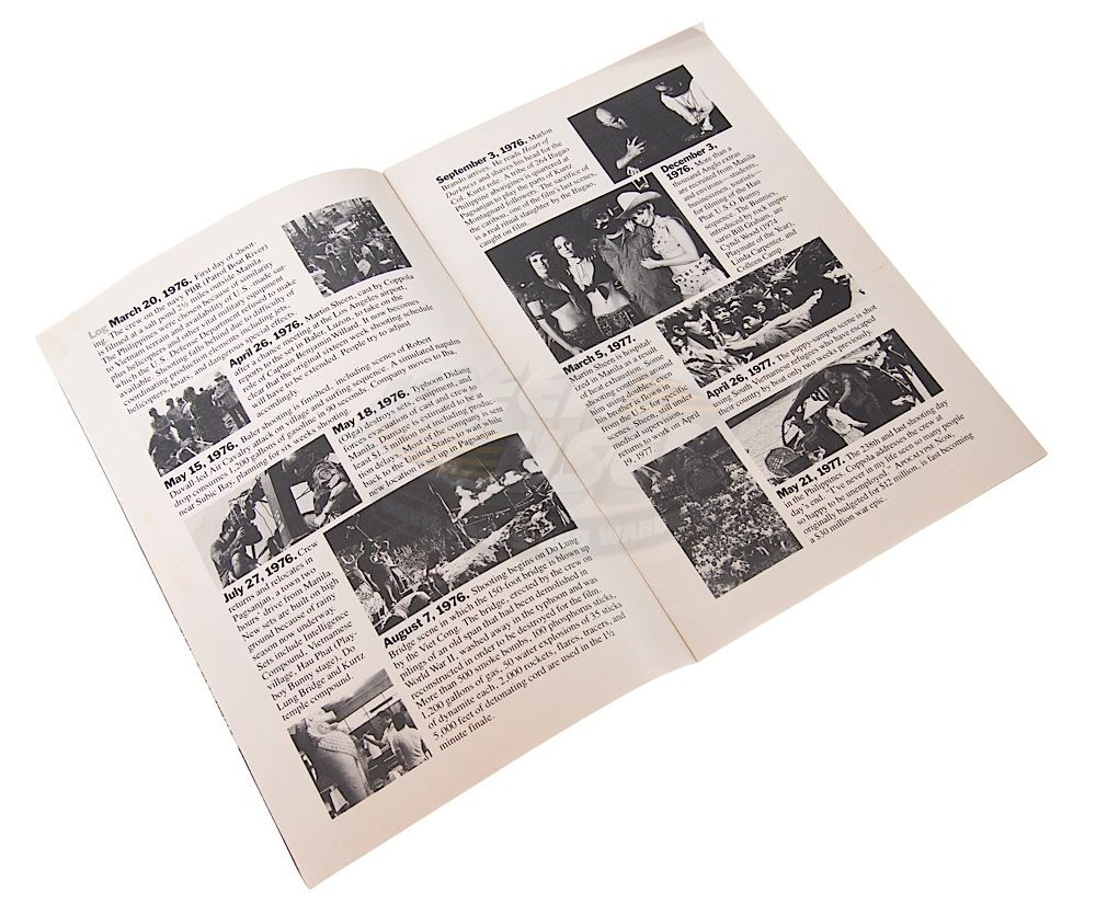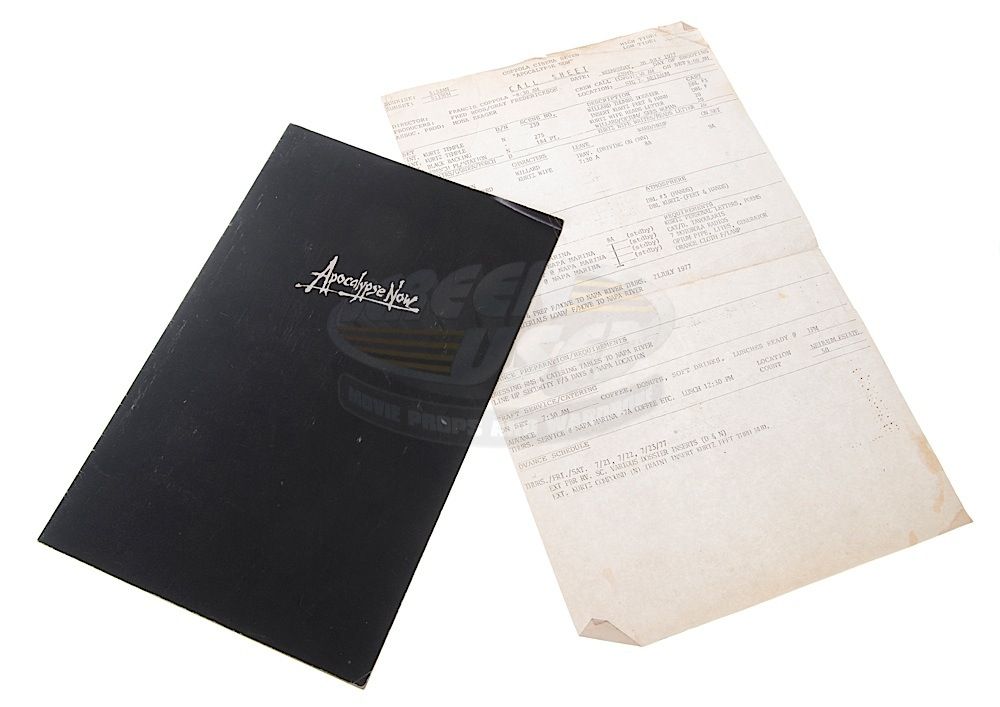(United Artists, 1979) This is an original production used call sheet dated Wednesday, July 20, 1977 (the 239th day of shooting). The single sided paper details the requirements of the days shoot. The piece measures 8.5" x 14", wear from use is present. A very rare production used artifact from the classic Francis Ford Coppola film. Included with the call sheet is a six page production booklet printed by United Artists that details various production dates, cast bios and lists the film's crew.