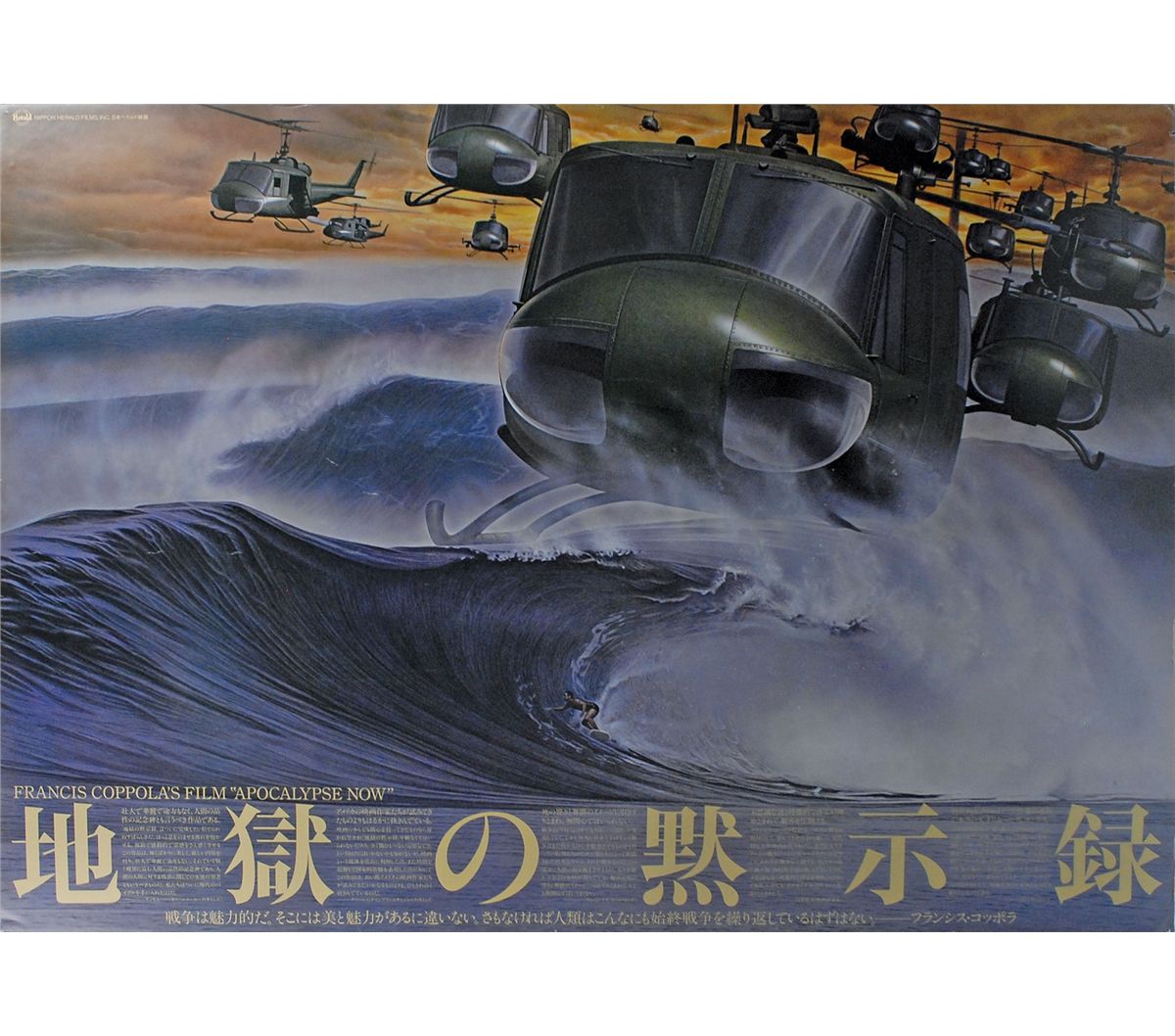 Uncommon and desirable original color 57.25 x 40.5 Japanese film poster for Francis Ford Coppola’s Apocalypse Now, printed by Nippon Herald Films, Inc., in 1979. Poster is affixed to an identical size piece of Foamcore. In fine condition, with some scattered edge dings and creases.