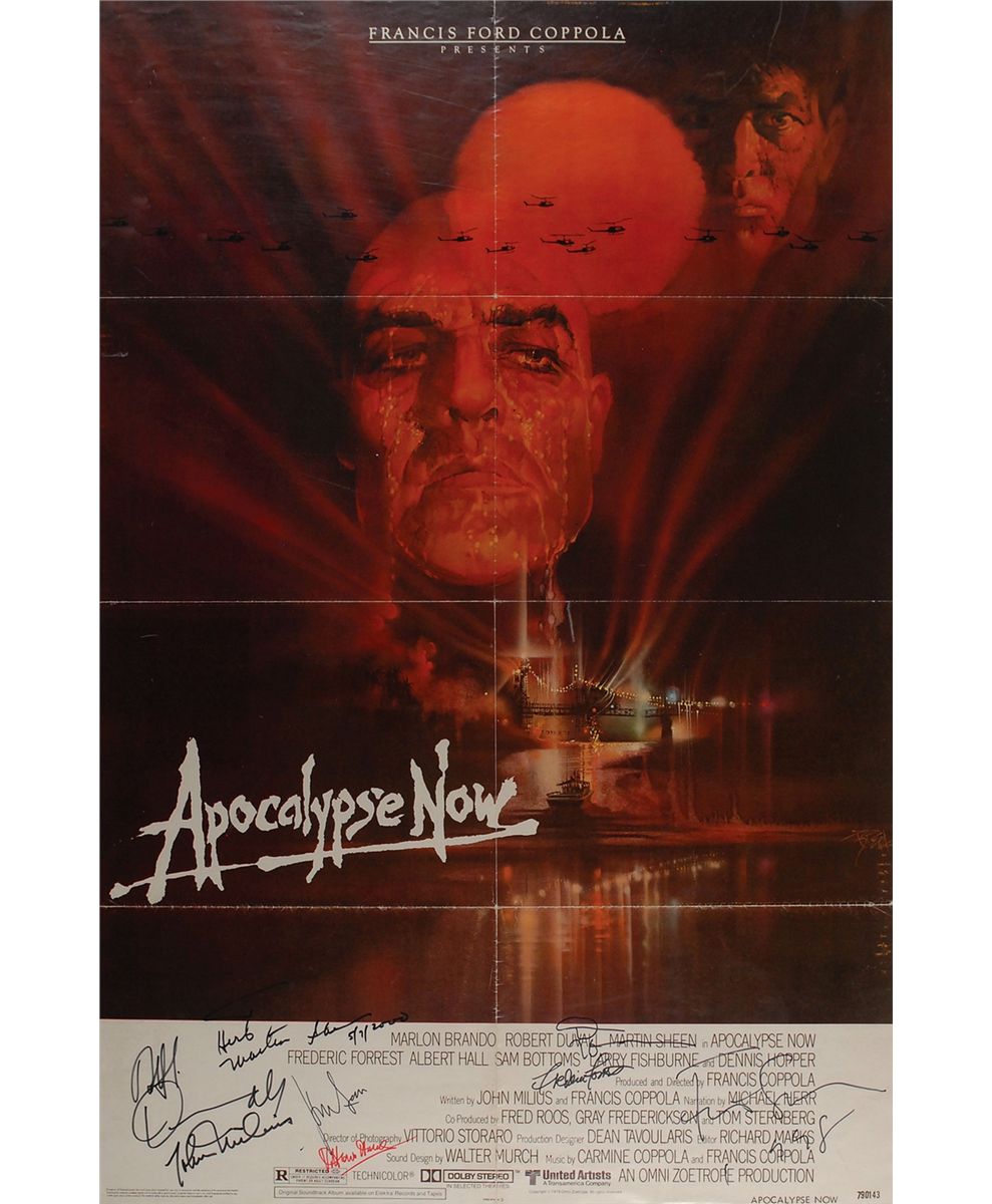 Color 27 x 41 one-sheet movie poster for the 1979 film Apocalypse Now, signed in felt tip by eight cast and crew members: Francis Ford Coppola, Robert Duvall, Martin Sheen (ins), Dennis Hopper, Harrison Ford, John Milius, Frederic Forrest, and Vittorio Storaro. A few small holes along intersecting folds, a bit of rubbing along top edge, and scattered light creases and wrinkles, otherwise fine condition. Rolled. From the collection of noted publisher and founder of Lord John Press, Herb Yellin.