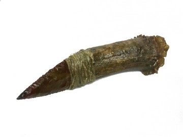 From Mel Gibson's harsh and bloody "Apocalypto", this is a villager's crude prop knife which is made with an arrowhead blade strapped to a piece of antler. (Approx. 7.25" x 2.5" x 2")