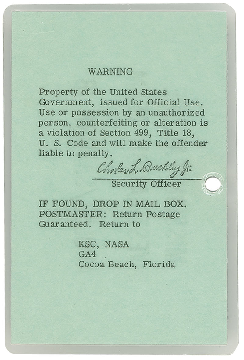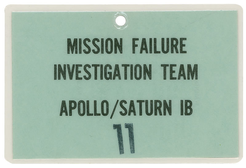 Rare Apollo 1 pale green investigation badge #11, measuring 3.5 x 2.25. These badges were issued to and worn by personnel involved in the investigation of the Apollo 1 fire. Badge reads, “Mission Failure Investigation Team, Apollo/Saturn 1B.” Badge has been laminated and a punch hole to top center is present. Reverse bears a printed government warning regarding unlawful possession or counterfeiting.