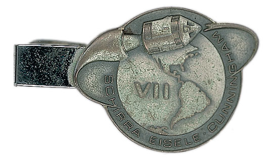 Flight-flown Apollo 7 Robbins Medal, approximately 1.25 x 1, with a raised design on the face of the mission insignia—a capsule orbiting Earth, the mission number, and the last names of crew members Wally Schirra, Donn Eisele, and Walt Cunningham. The reverse of the sterling silver medal is engraved “Oct. 11, 1968” and numbered “251.” Normal condition. This medal was originally owned by Schirra, who had it permanently affixed to a tie bar—the only such example known to exist!