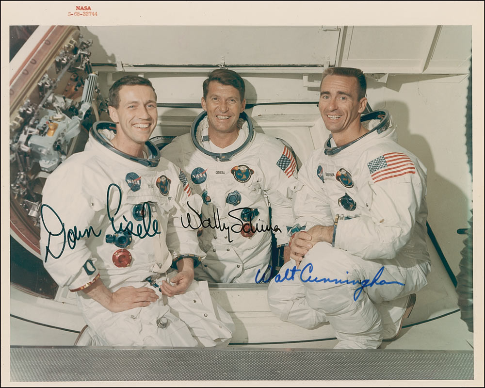 Color 10 x 8 semi-glossy ‘red-numbered’ NASA photo of the crew posing together during training, signed in black felt tip by Donn Eisele and Wally Schirra, and in blue felt tip by Walt Cunningham. In fine condition, with paperclip impressions along top edge, some scattered light surface marks and impressions, and a few fingerprints.