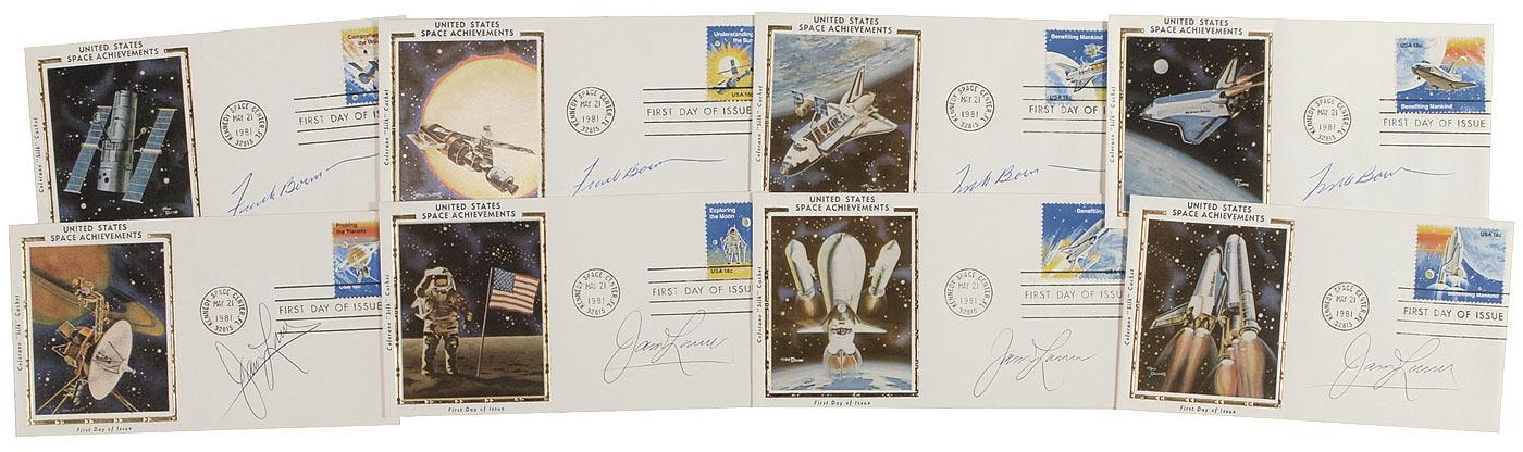 Eight different FDCs, each bearing a cachet relating to US space achievement: four signed in blue ballpoint by Frank Borman and four signed in black ballpoint by James Lovell. In overall fine condition.