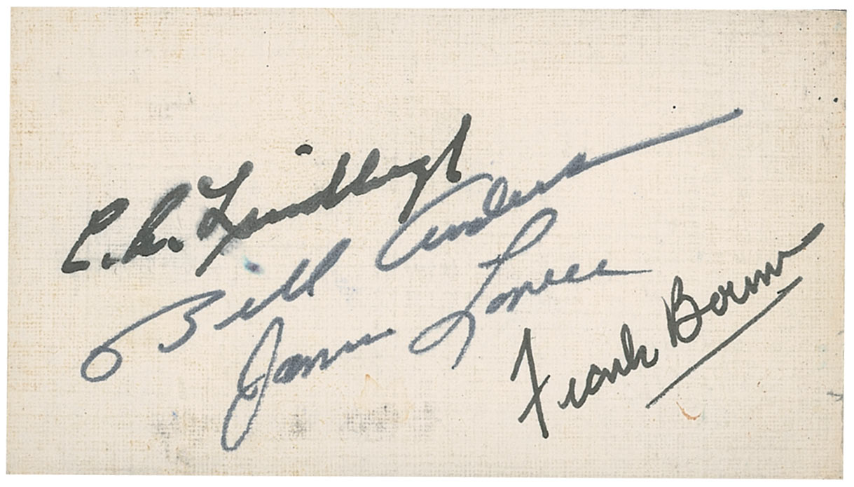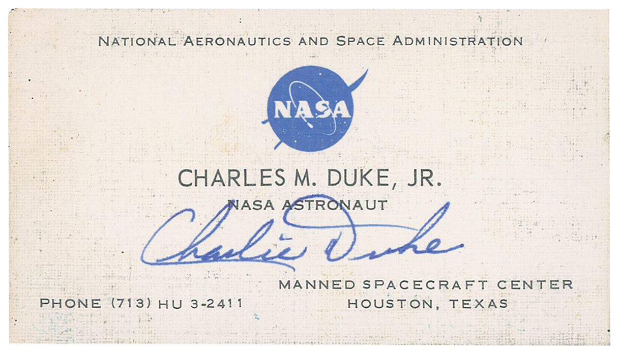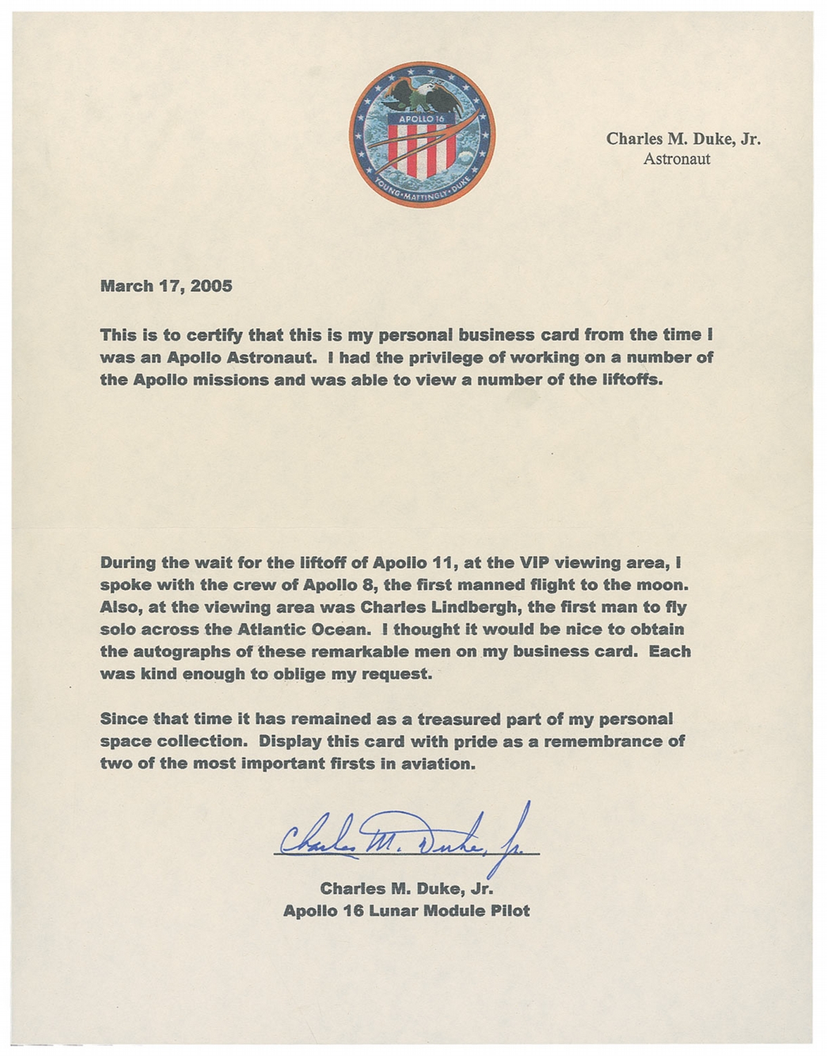 One of Charlie Duke’s personal NASA business cards, 3.5 x 2, signed on the reverse in black ink and felt tip, “C. A. Lindbergh,” “Bill Anders,” “James Lovell,” and “Frank Borman.” Card is also signed on the front in blue ink by Duke. In fine condition, with scattered mild soiling to both sides, and a couple trivial brushes to Lindbergh’s signature. Accompanied by a 2005 letter of authenticity signed by Duke which reads, in part: “During the wait for the liftoff of Apollo 11, at the VIP viewing area, I spoke with the crew of Apollo 8…also at the viewing area was Charles Lindbergh, the first man to fly solo across the Atlantic Ocean. I thought it would be nice to obtain the autographs of these remarkable men on my business card. Each was kind enough to oblige my request. Since that time it has remained a treasured part of my personal space collection.” A unique and fitting combination of the first human to fly from the ‘New World’ to the ‘Old World’ and the first humans to leave Earth.