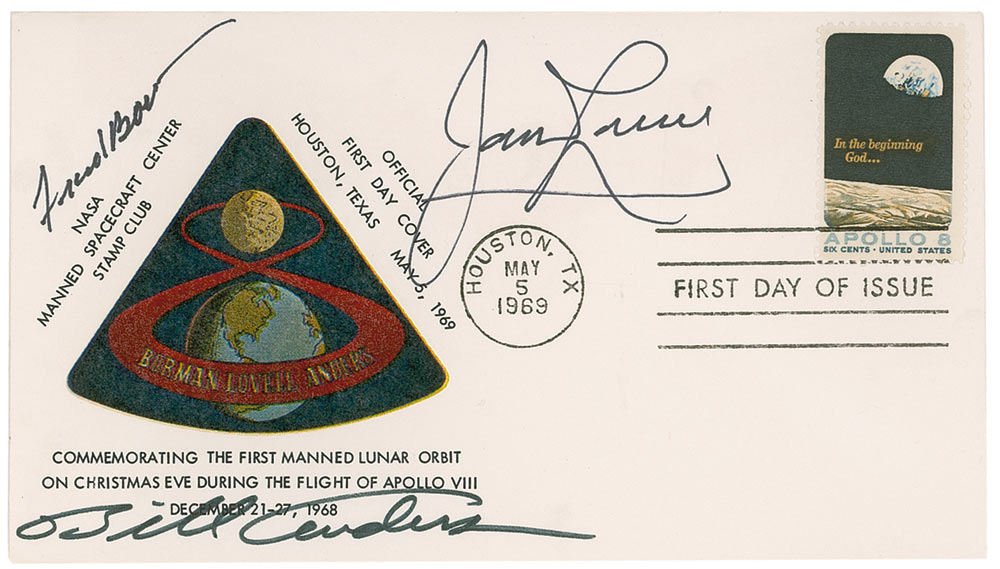 FDC with a cachet honoring the Apollo 8 mission, signed in black felt tip by Bill Anders, Frank Borman, and James Lovell. In very fine condition. Anders is scarce in any form!