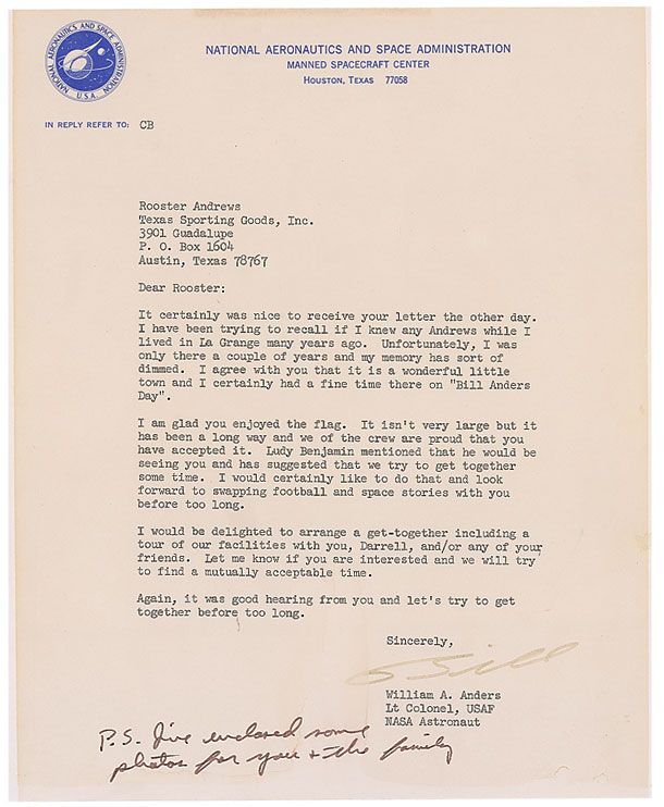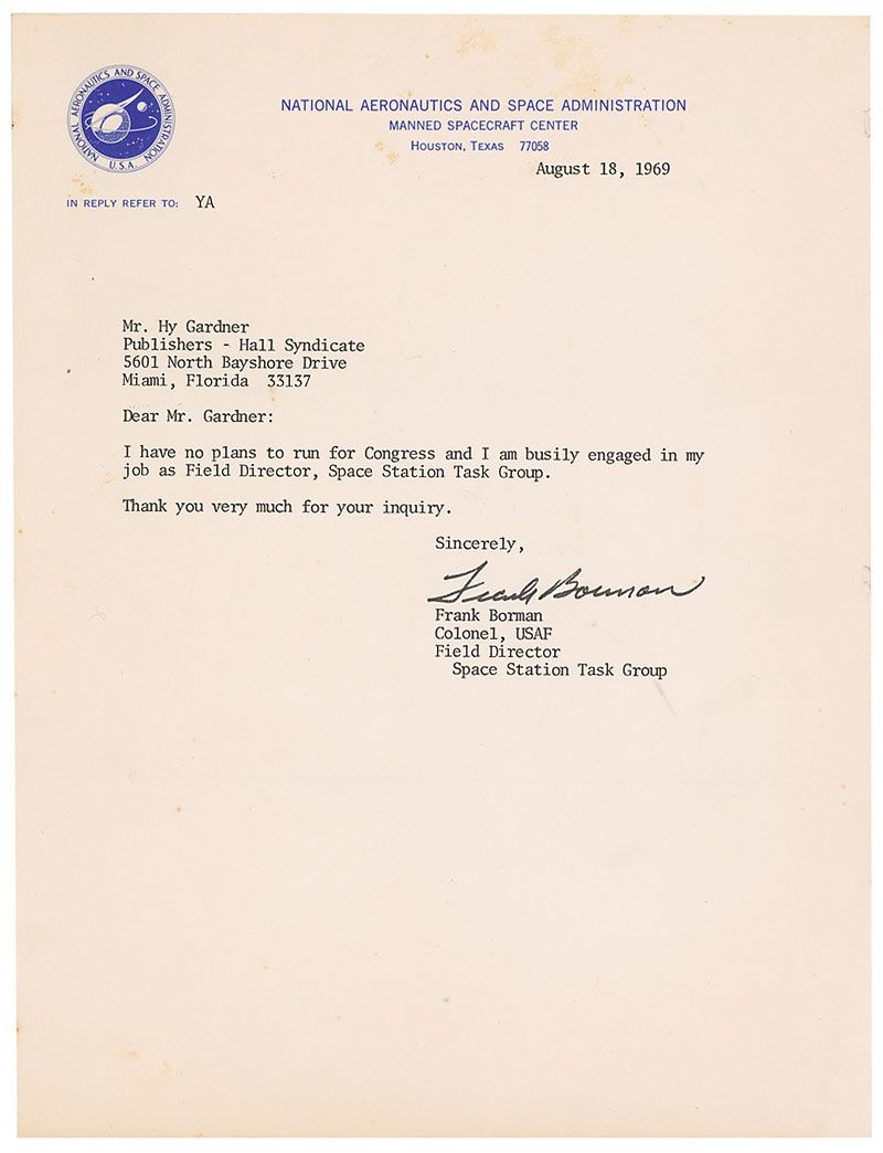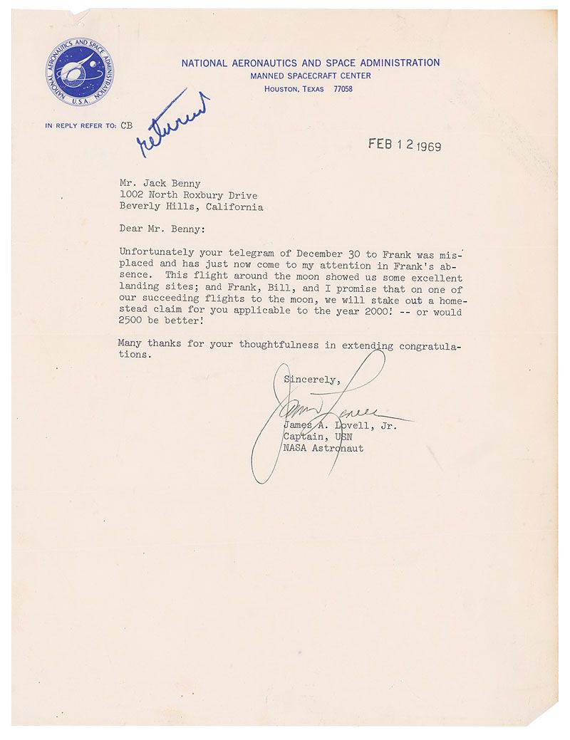 Three one-page TLSs, each on NASA letterhead, individually signed by James Lovell, Frank Borman, and William Anders (signed “Bill”), two dated 1969. The Lovell letter, to entertainer Jack Benny, reads in part: “This flight around the moon showed us some excellent landing sites; and Frank, Bill, and I promise that on one of our succeeding flights to the moon, we will stake out a homestead claim for you applicable to the year 2000!” Borman’s letter to publisher Hy Gardner reads in full: “I have no plans to fun for Congress and I am busily engaged in my job as Field Director, Space Station Task Group.” Anders’ letter to Rooster Andrews reads in part: “I am glad you enjoyed the flag. It isn’t very large but it has been a long way and we of the crew are proud that you have accepted it.” He has added a brief postscript. Light uniform toning covering each page, scattered wrinkles and light creasing, areas of faint staining, a staple hole to Lovell’s letter with “returned” written at the top of the page, and Anders’ signature somewhat faded, otherwise overall very good to fine condition. Accompanied by Lovell’s original mailing envelope and a letter of authenticity signed by Gardner’s widow.