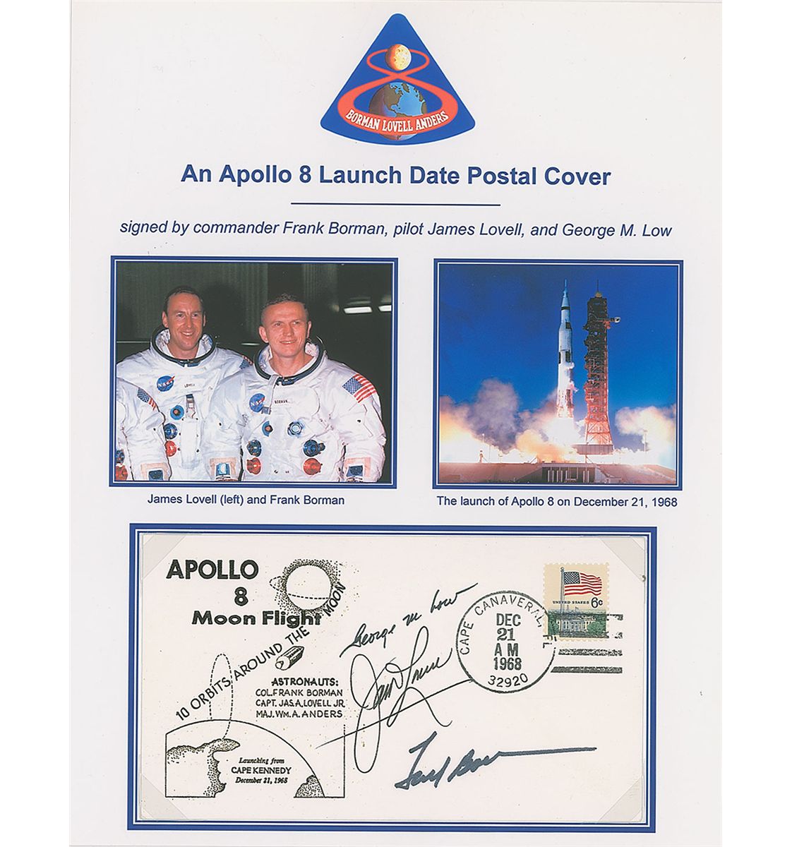 Apollo 8 launch date postal cover with a cachet honoring the Apollo 8 mission, signed in black ink and felt tip by Frank Borman, James Lovell, and George M. Low. Removably presented on a color 8.5 x 11 informational sheet. In fine condition.