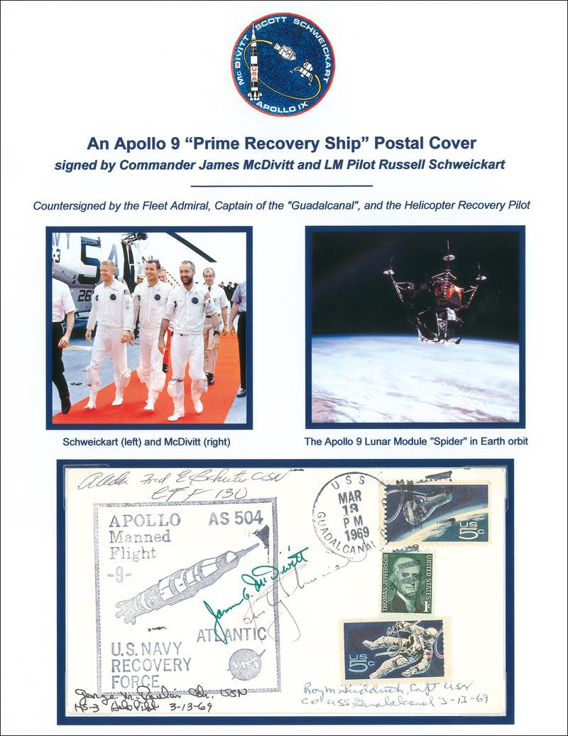 Apollo 9 Prime Recovery Ship postal cover honoring the naval recovery force, signed in ink by James McDivitt and Rusty Schweickart, as well as three members of the recovery force. Removably presented on a color 8.5 x 11 informational sheet. In fine condition.