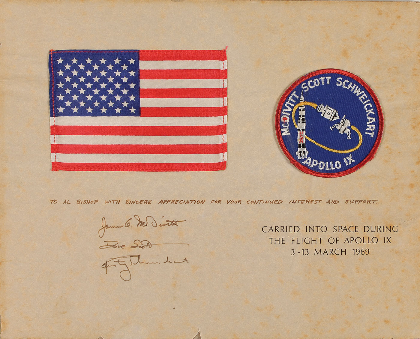 Flight-flown printed American flag, 6 x 4, along with a flight-flown crew emblem patch, 3.5-inch diameter, flown aboard Apollo 9, the third manned Apollo spaceflight during a 10-day voyage in March 1969. Both items are affixed to a 13.5 x 11 certificate stating: “Carried into space during the flight of Apollo IX 3–13 March 1969.” Signed in black felt tip by James A. McDivitt, Rusty Schweickart, and Dave Scott who has added “To Al Bishop with sincere appreciation for your continued interest and support.” Affixed to a same-sized piece of cardstock. In very good condition with mild toning, foxing, wrinkling, and a few edge tears. The patch and flag are largely unaffected. Bishop, the original recipient, was a close friend and confidant to many of the Apollo astronauts and created specially produced cachet envelopes that the crews of Apollo 12 through Apollo 16 carried with them on their lunar voyages. Such a presentation from a crew with attached flight-flown items are uncommon.