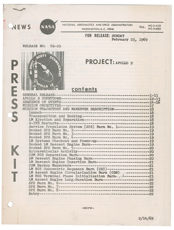 Apollo 09 press kit, 8 x 10.5, dated February 14, 1969. Lengthy kit provides detailed information of the entire mission. Punch holes to left edge, staple to top left, and a couple tears to cover page, otherwise fine condition. Accompanied by a certificate of authenticity from Novaspace as part of the Jim McDivitt Garage Sale.