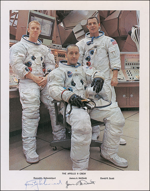 Color 11 x 14 NASA photo showing a relaxed Apollo 9 crew in their white spacesuits, signed in blue ballpoint “Rusty Schweickart” and in black felt tip “James A. McDivitt.” In fine condition, with a couple of corner creases.